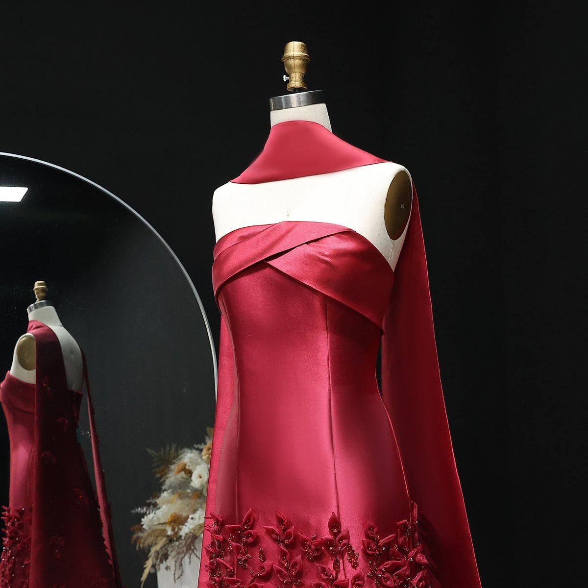 Indulge in luxury and glamour with our Dreamy Vow 3D Leaves Blush Pink Evening Dress. Crafted from high-quality satin, this mermaid style gown features a delicate cape and intricate floral details, perfect for a Dubai or Arabic-inspired wedding or prom. Embrace your inner goddess with this stunning piece.