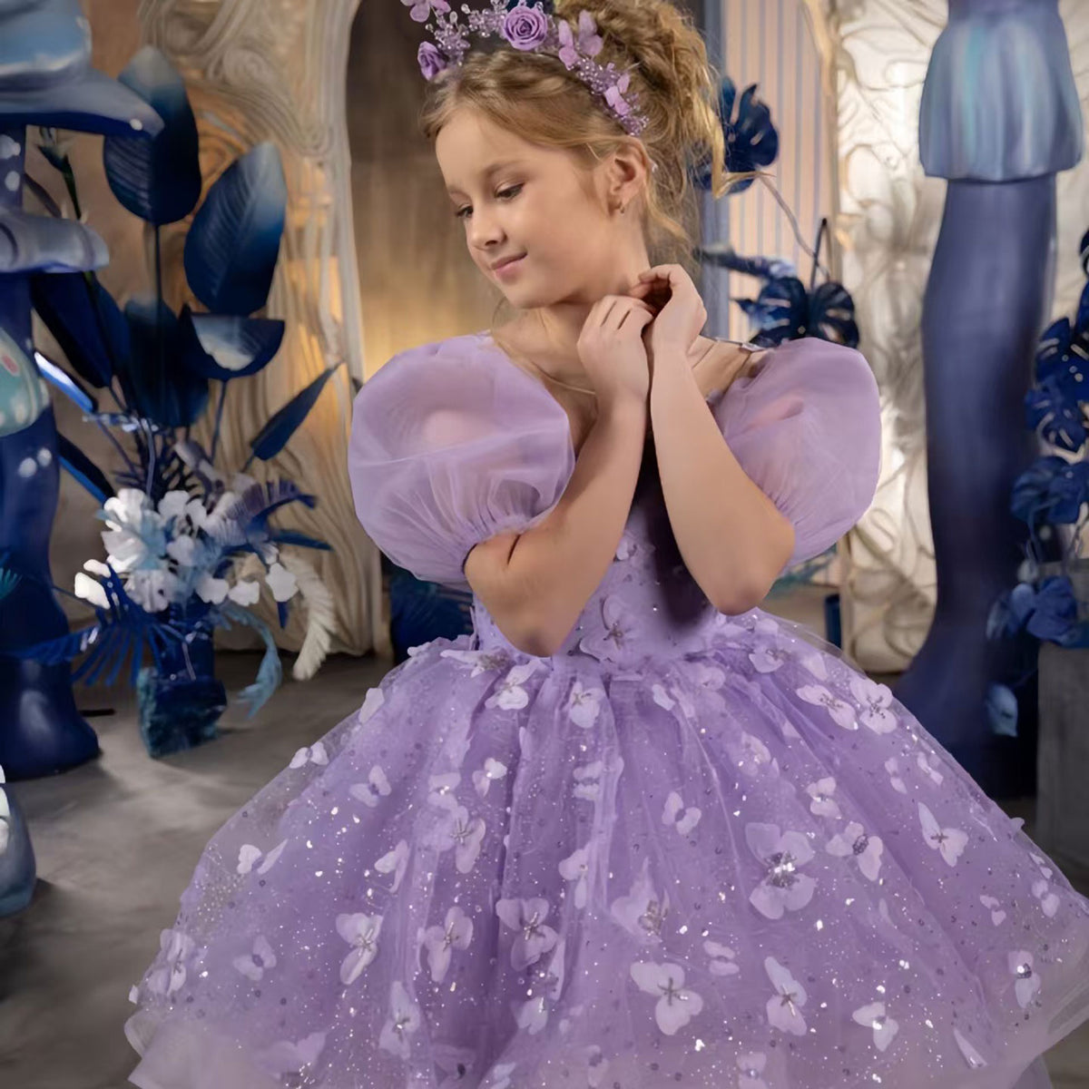 Applique Puff Sleeve Tulle Flower Girl Dress With Trailing J779