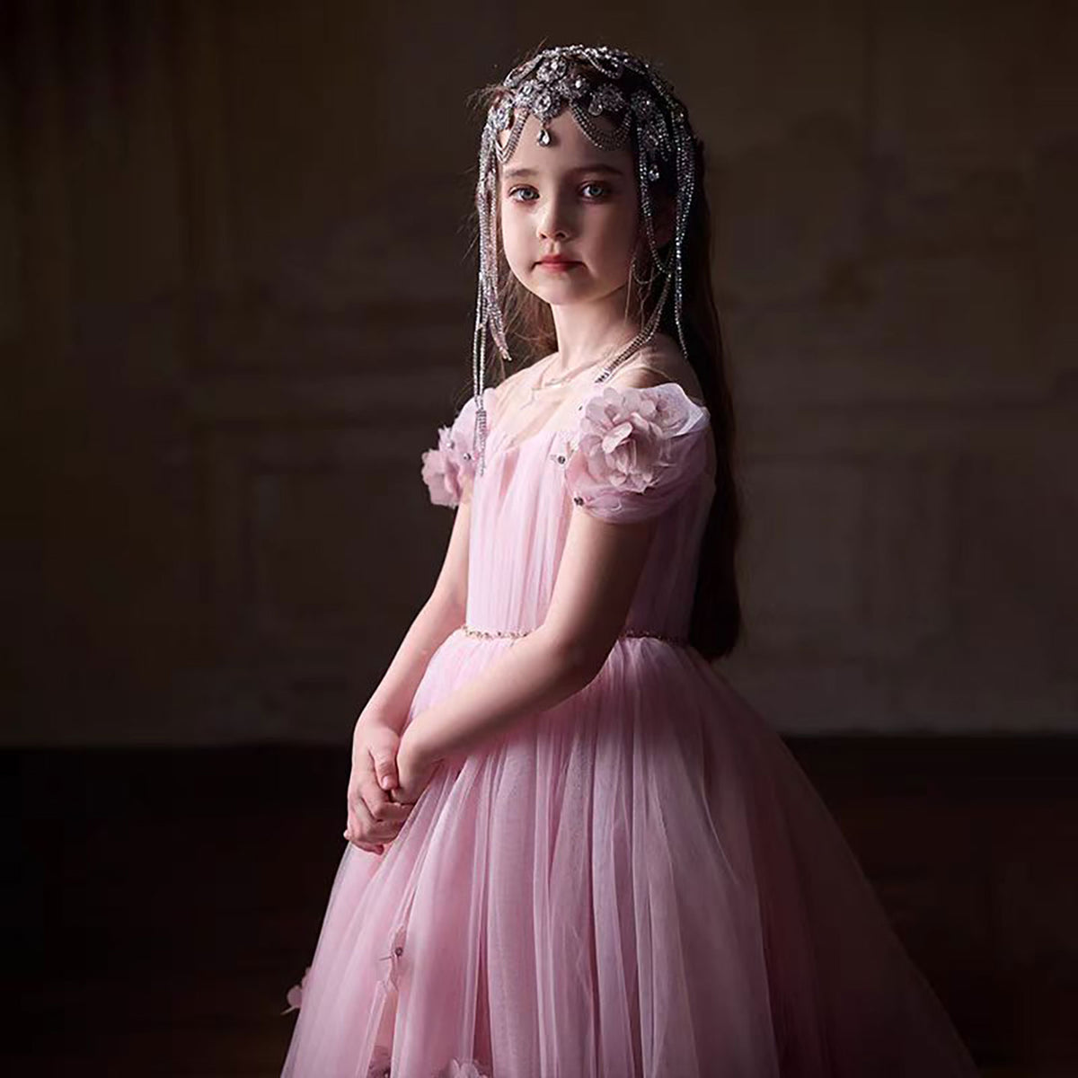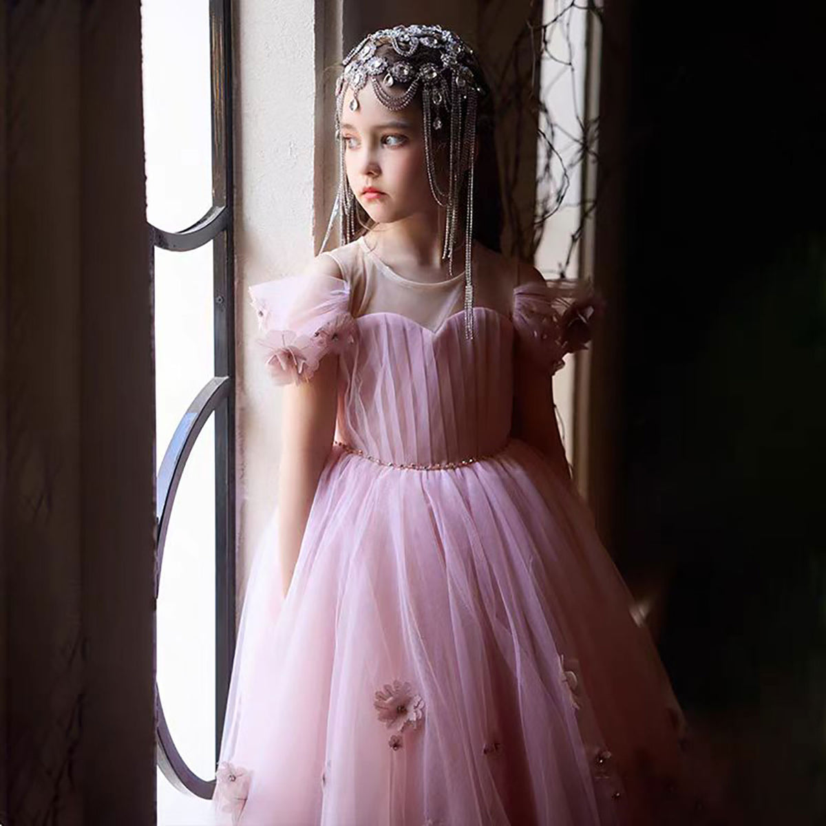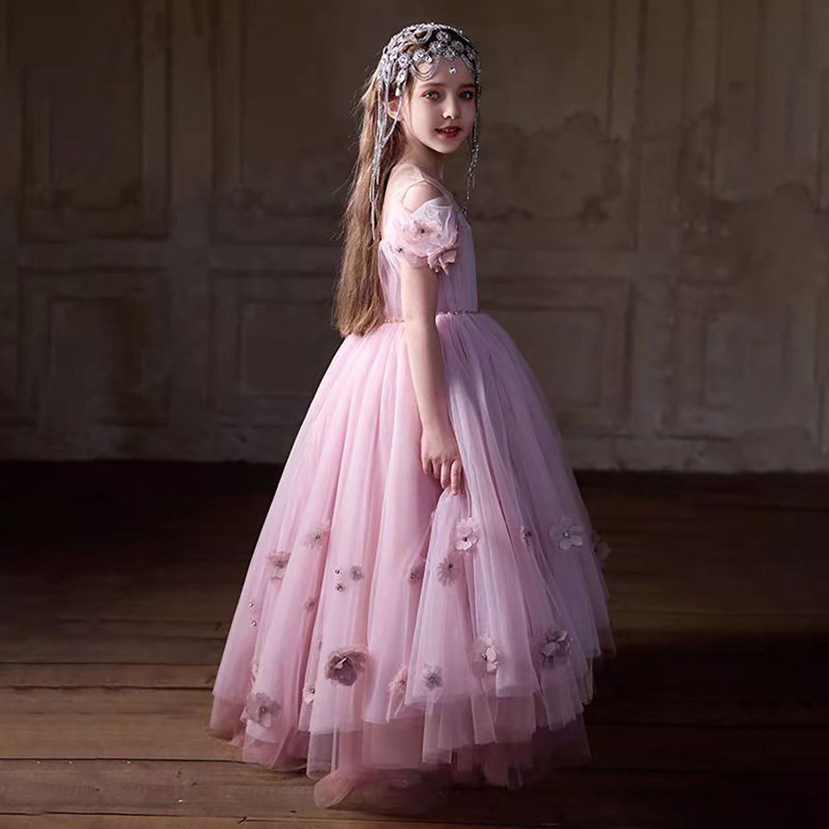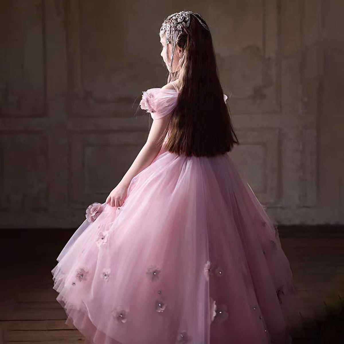 Applique Tiered Tulle Flower Girl Dress Pink J091