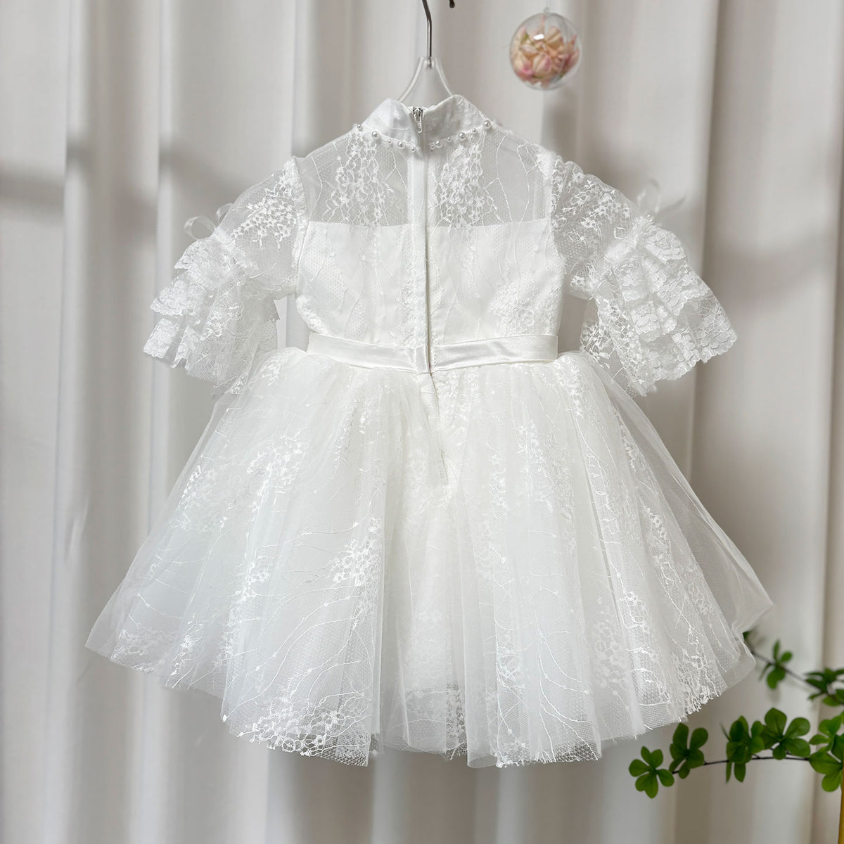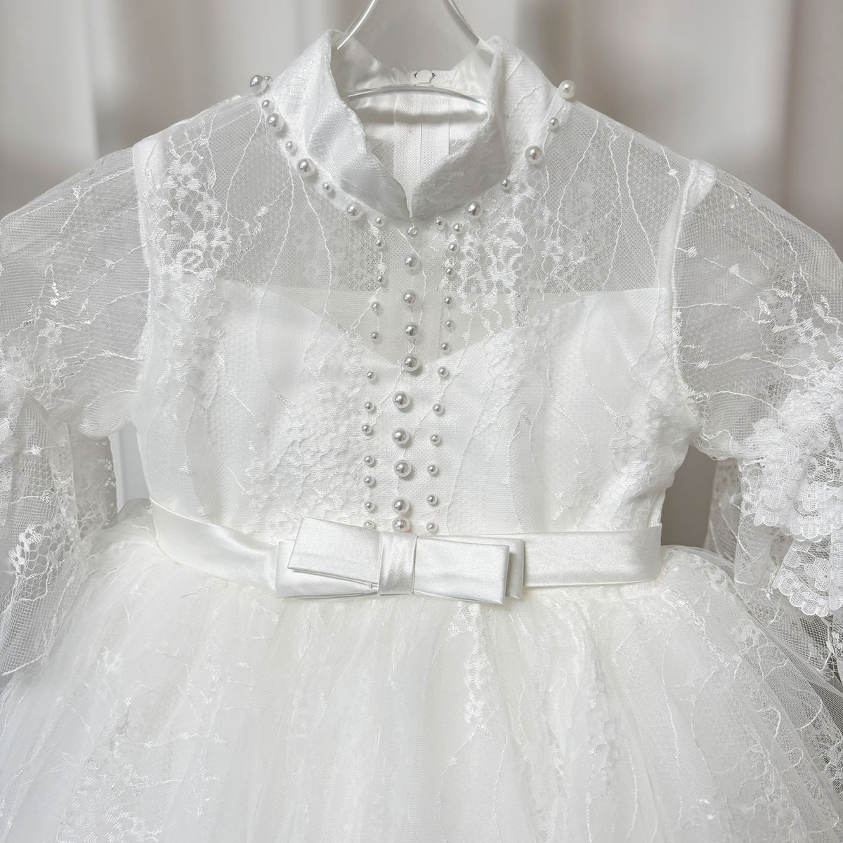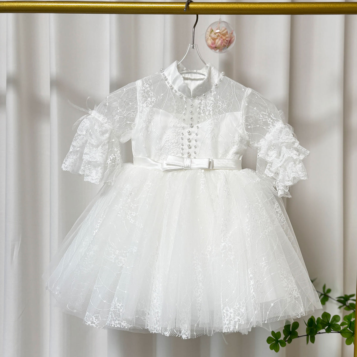 Lace Tulle Pearl White Flower Girl Dress Waist Bowed D023