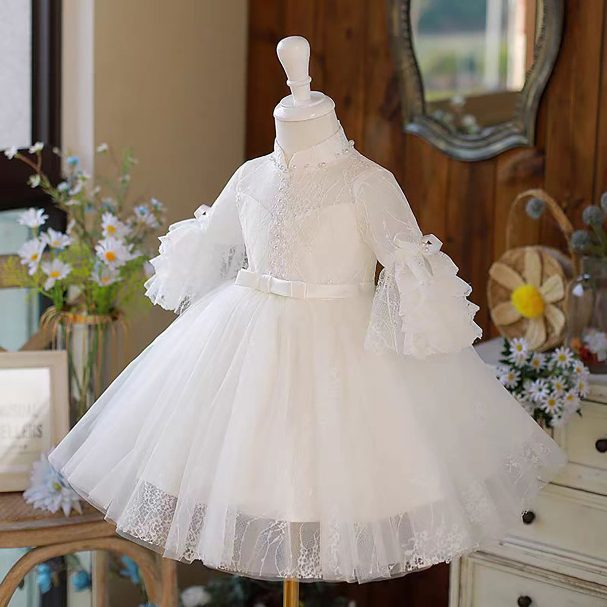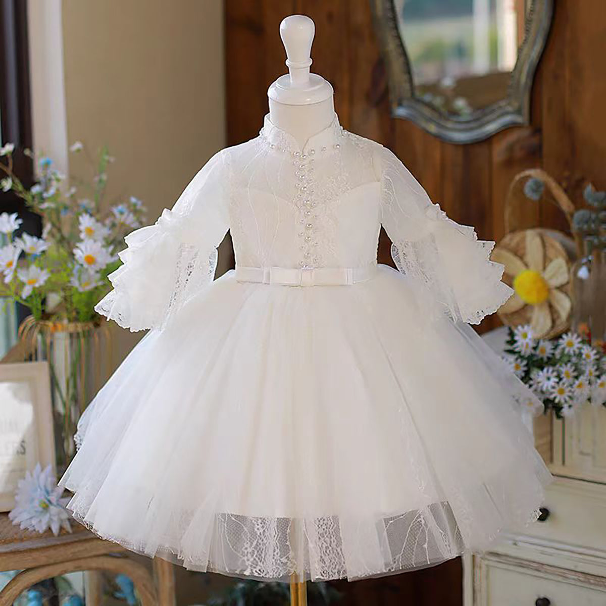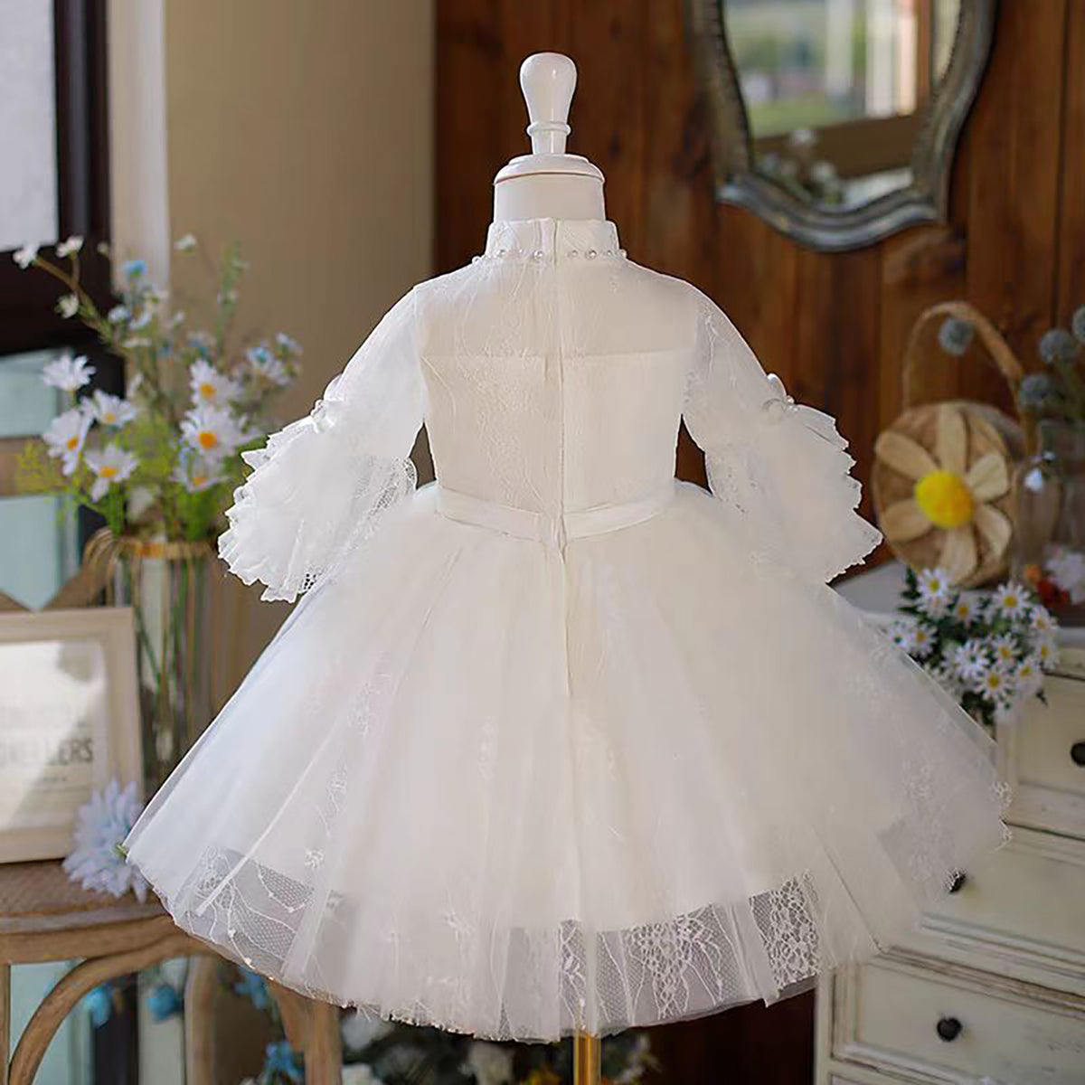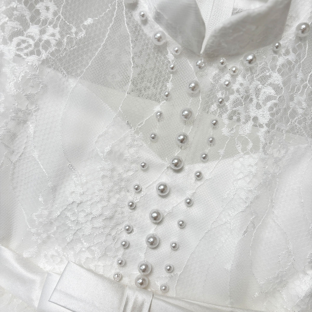 Lace Tulle Pearl White Flower Girl Dress Waist Bowed D023