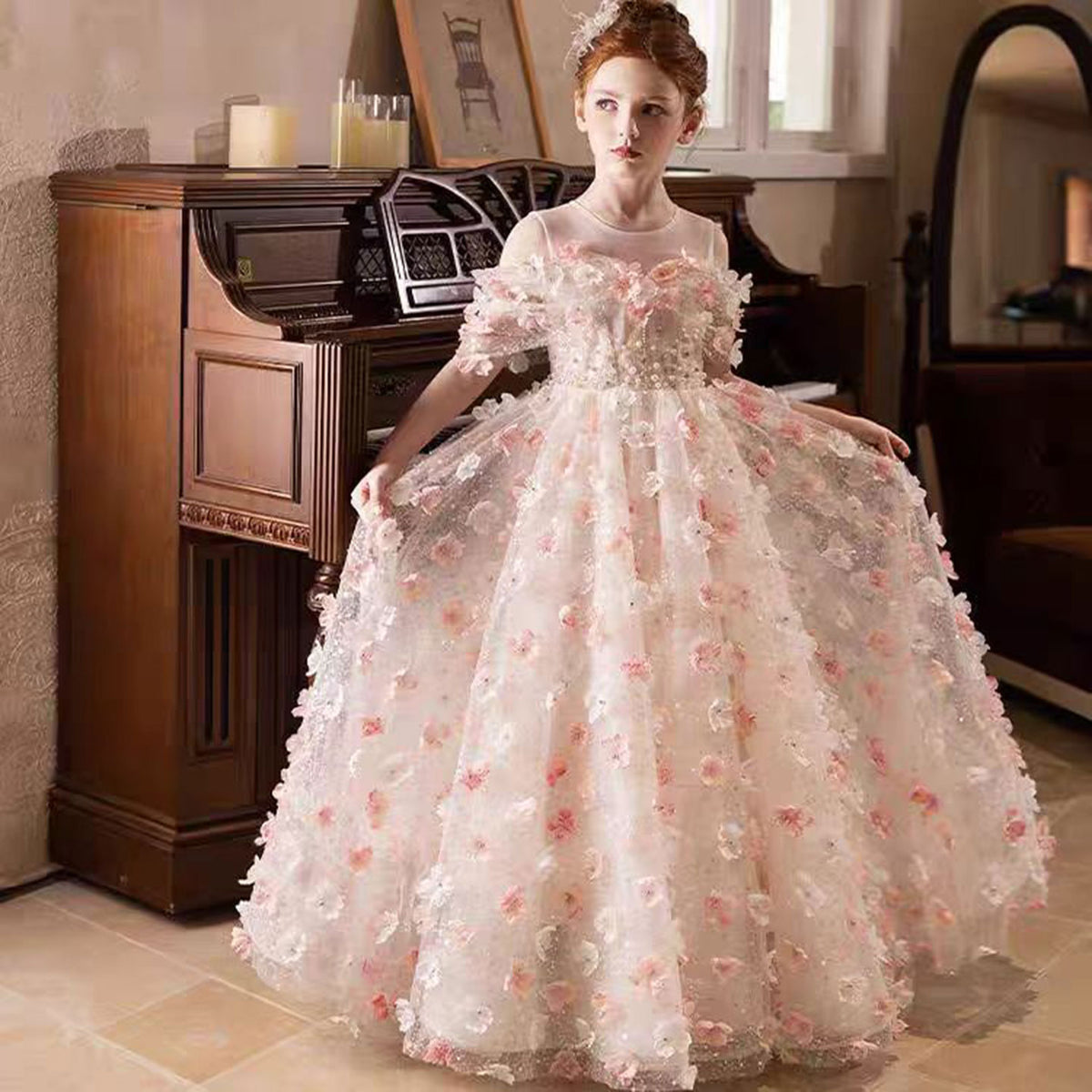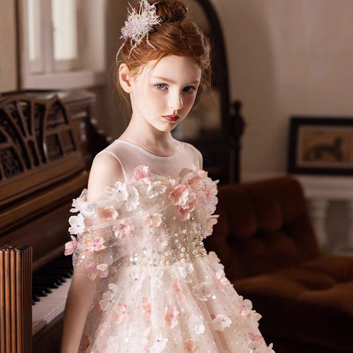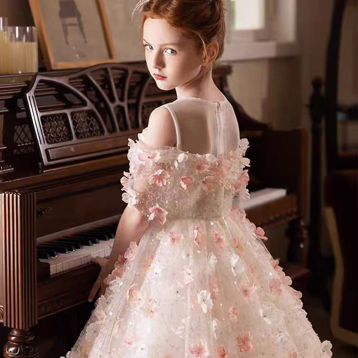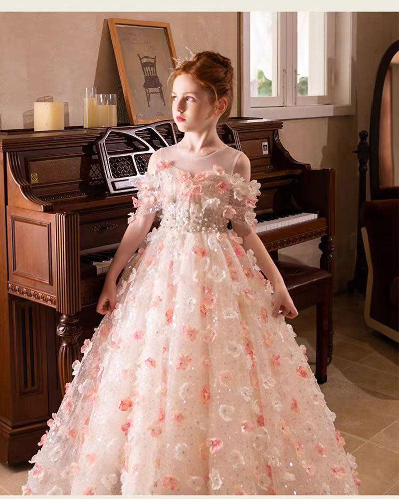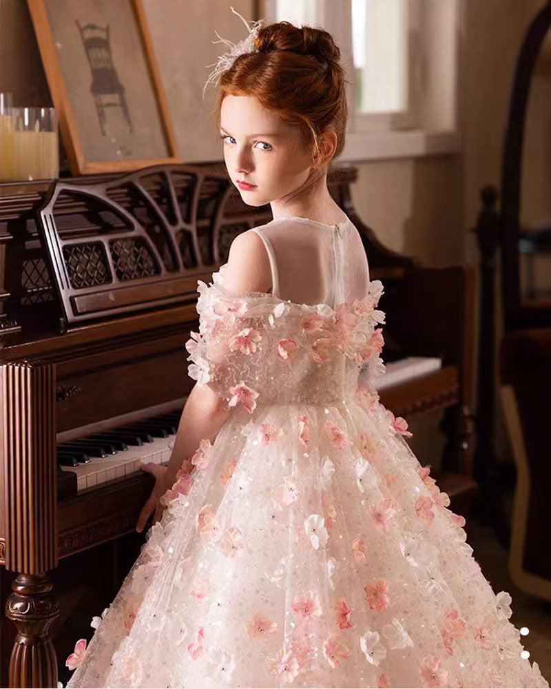 Off-Shoulder Flower-Adorned Pearled Flower Girl Dress J011