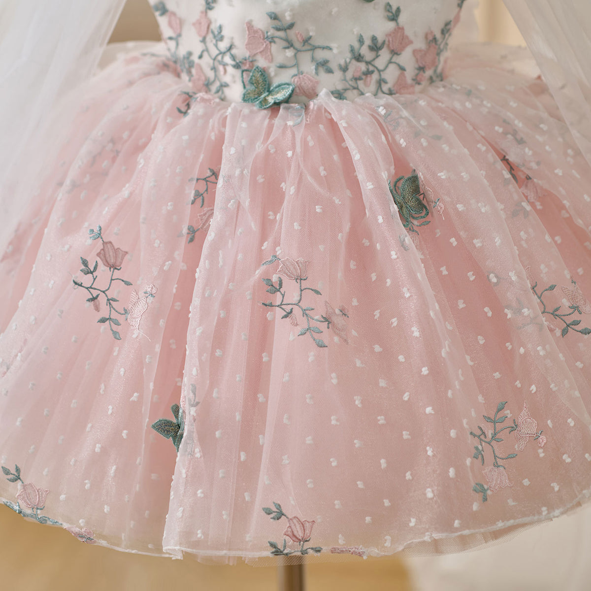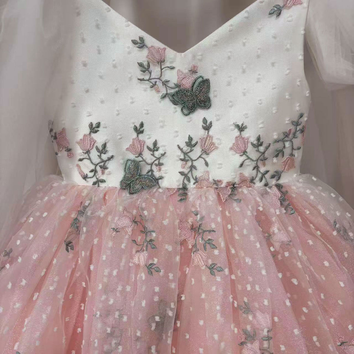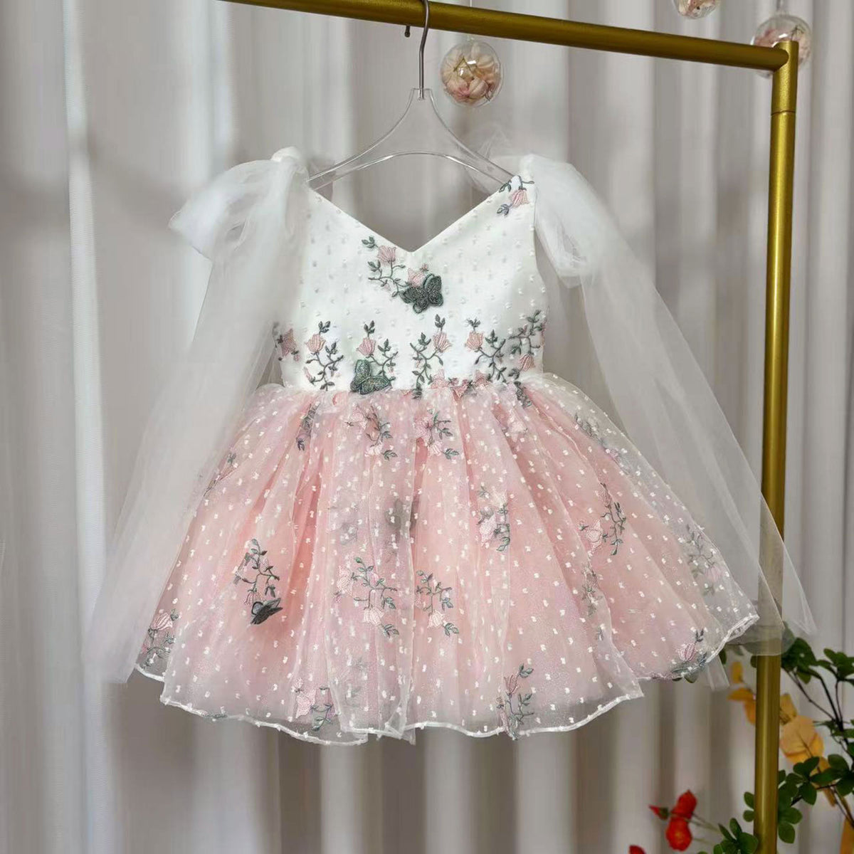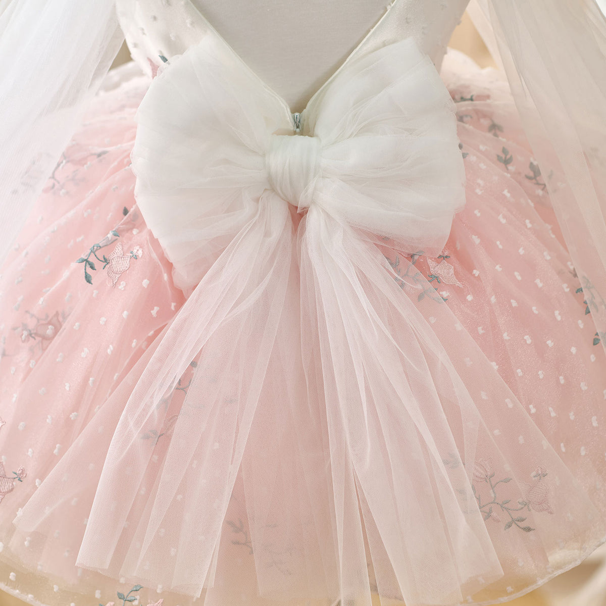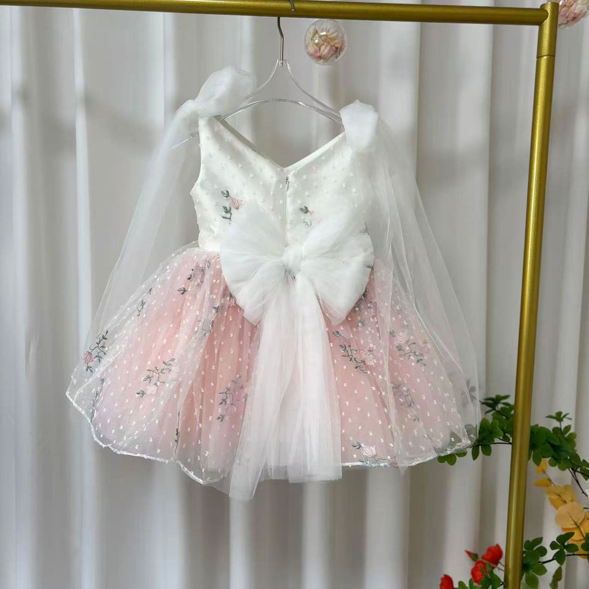V-Neck Embroidered Flower Girl Dress Bow On Shoulder J470