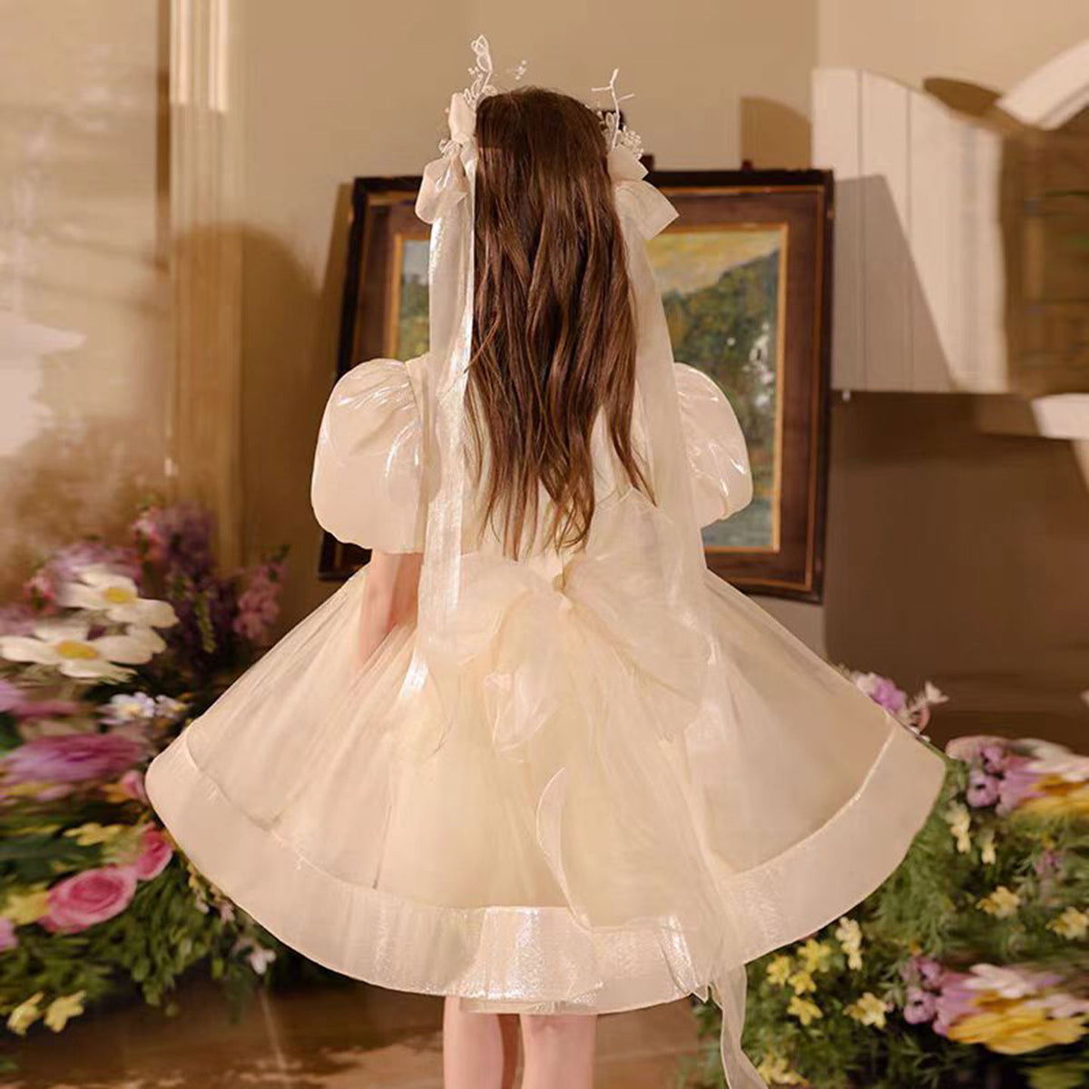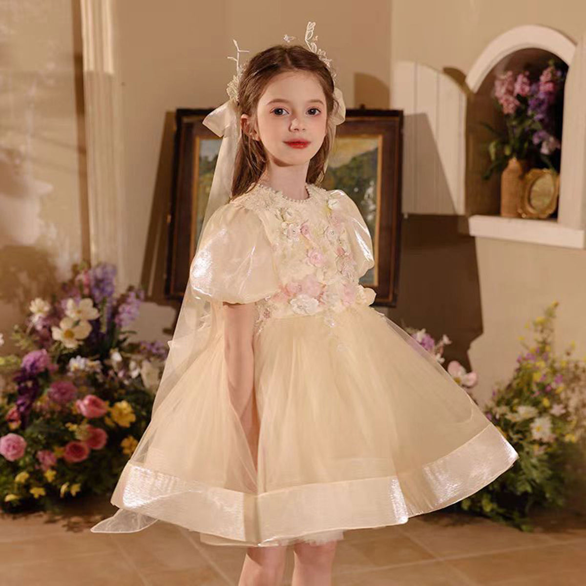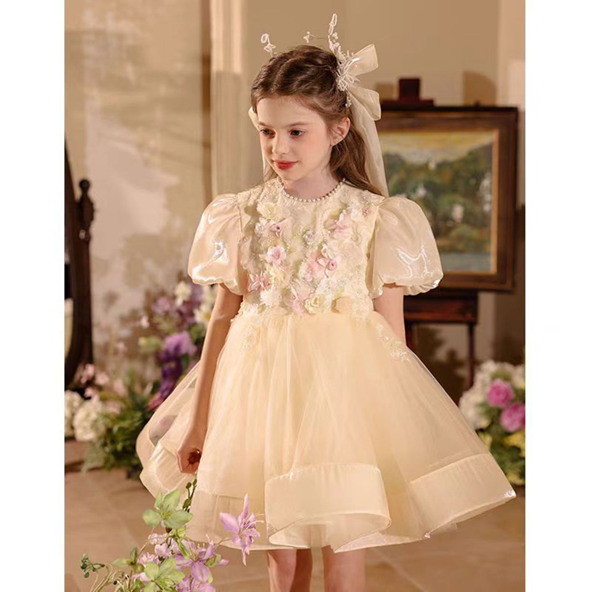 Adorable Applique Pearl Tulle Flower Girl Dress Champagne J504