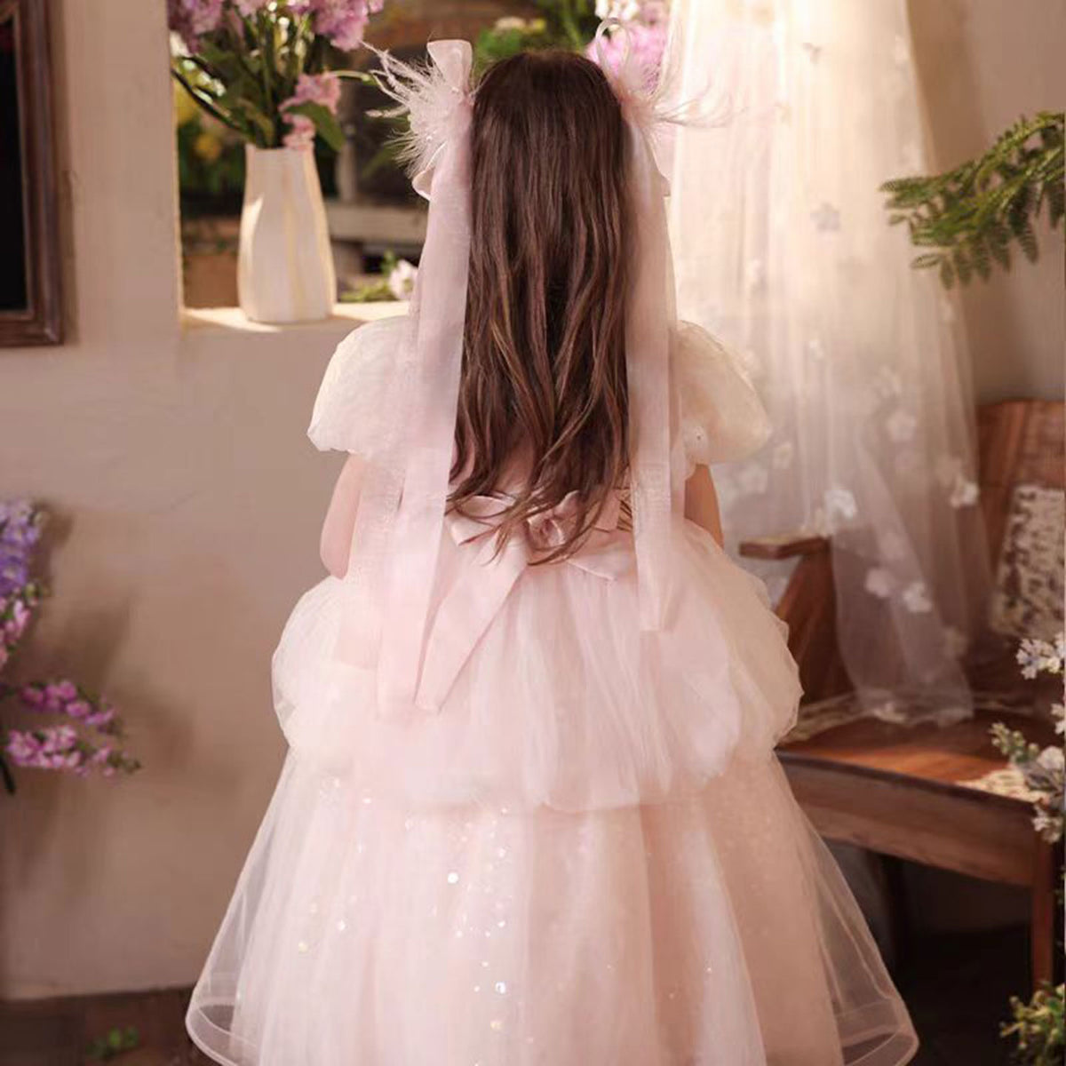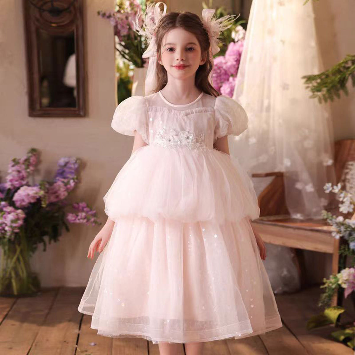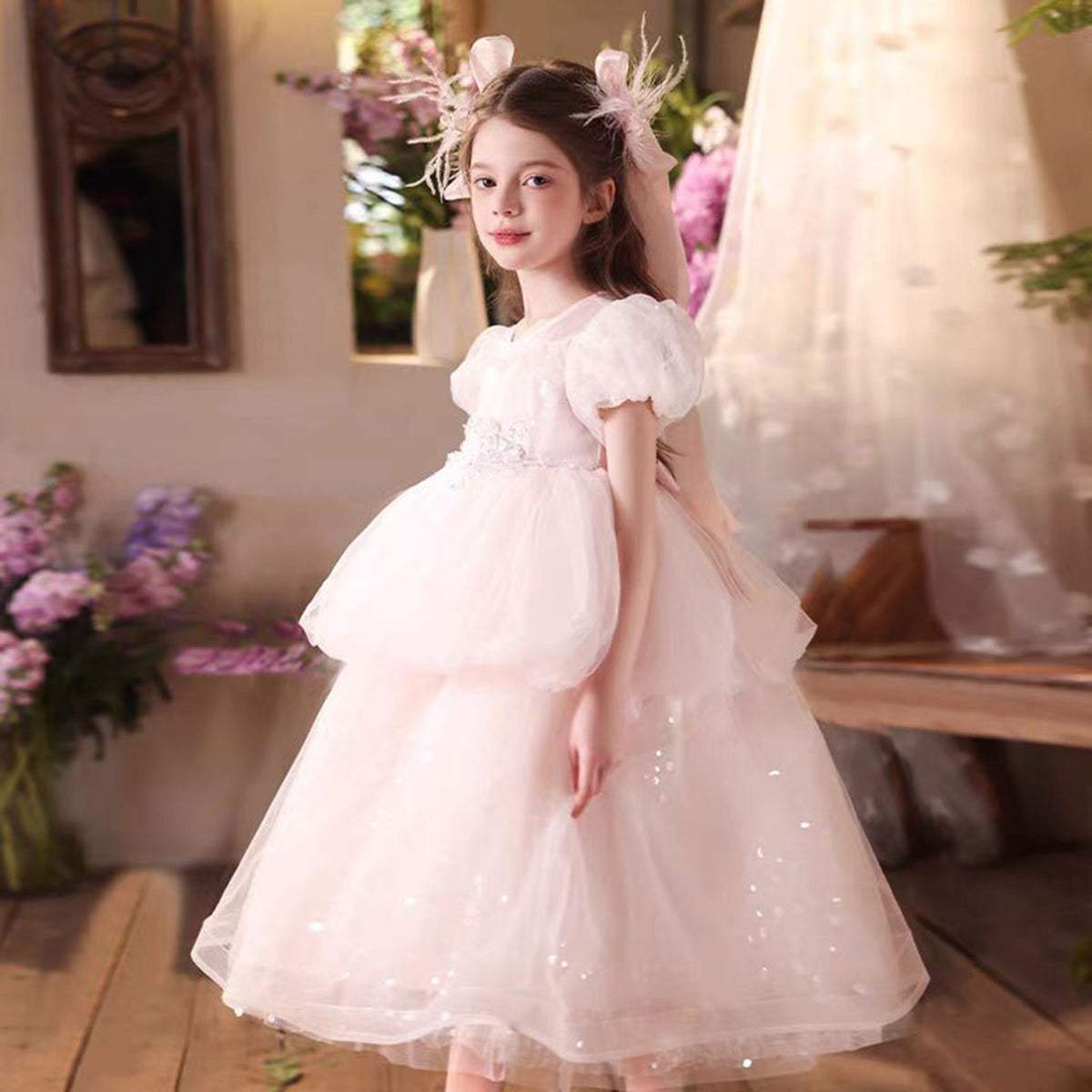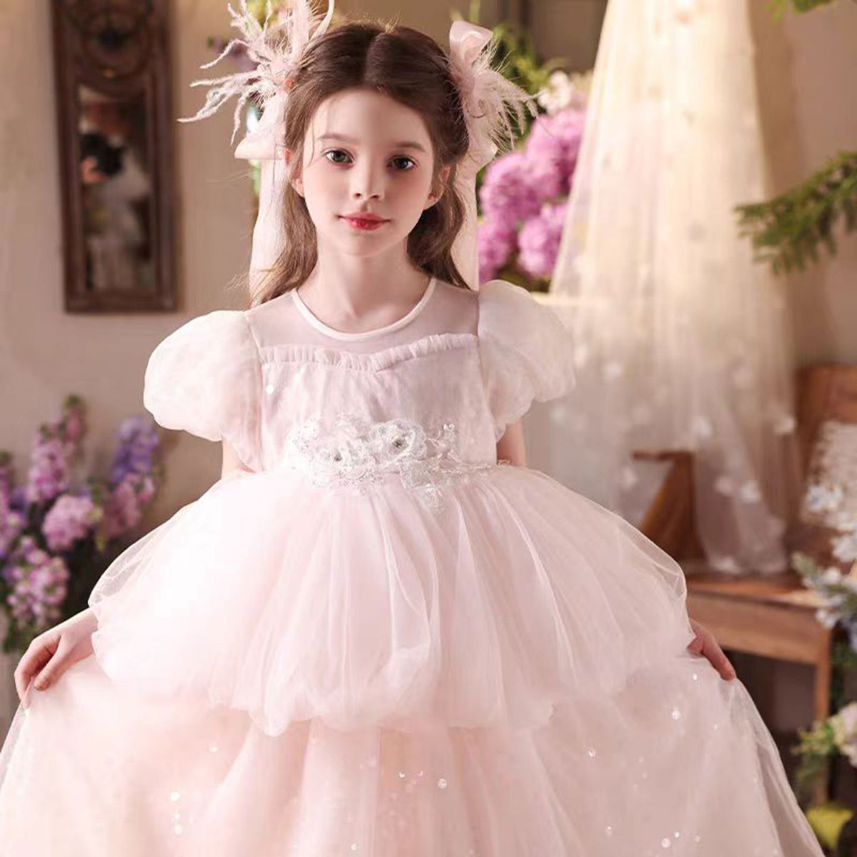 Elegant Sequined Tulle Flower Girl Dress With Bow Pink J522