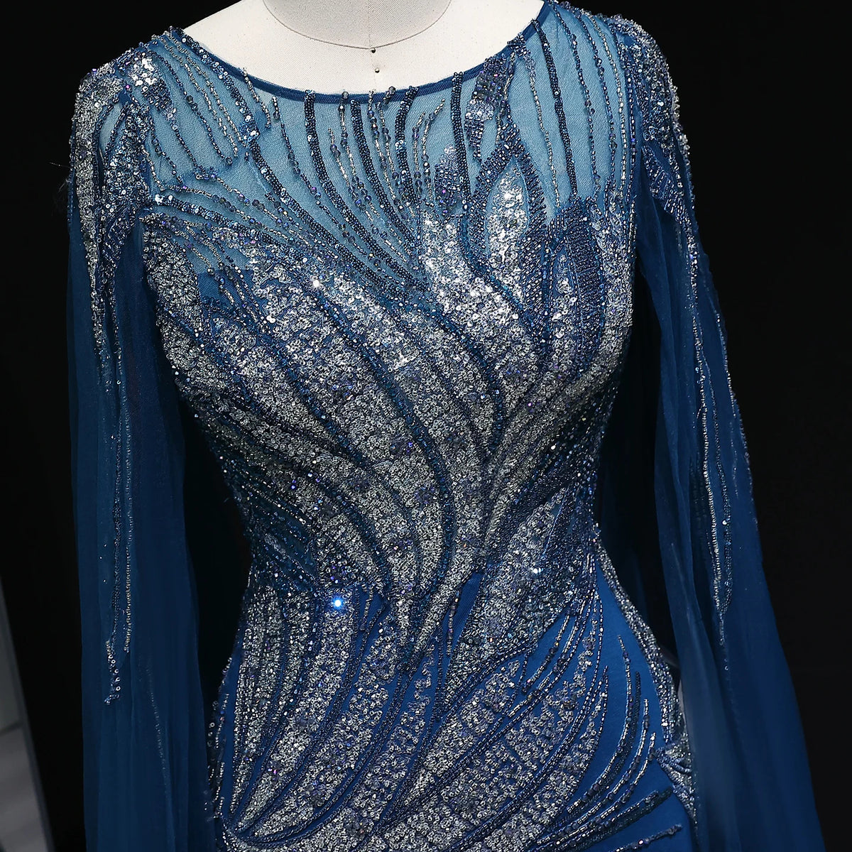 Elevate your evening elegance with this Luxury Black Gold Beaded Arabic Dress, featuring intricate beadwork that highlights its sophisticated design. The dramatic cape sleeve adds a striking silhouette, blending traditional Arabic style with modern luxury. Perfect for formal occasions, this dress offers a refined statement of grace and glamour.