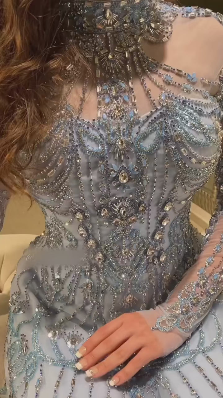 Luxury Blue Long Sleeves High Neck Evening Dress SS587