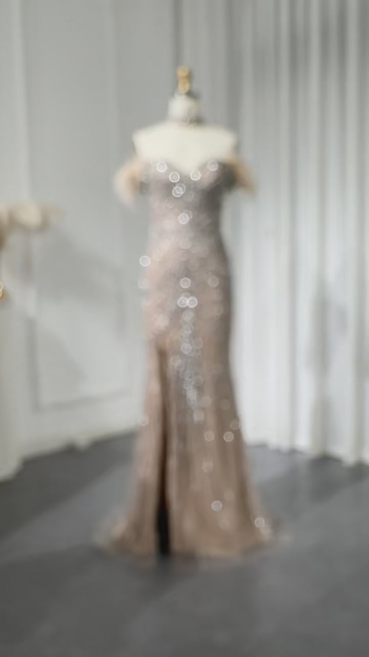 Luxury Feather Off Shoulder Evening Dress with Chocker SS167