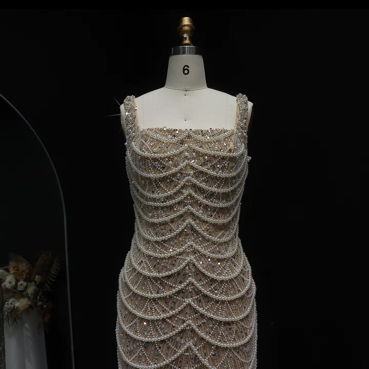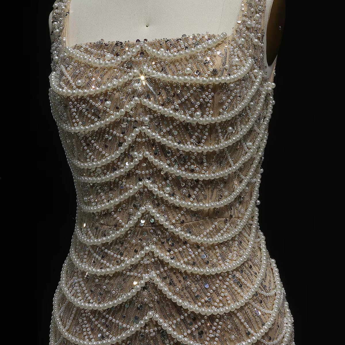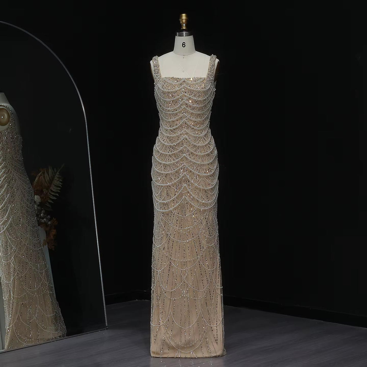 Luxury Pearls Nude Spaghetti Strap Evening Dress SS682