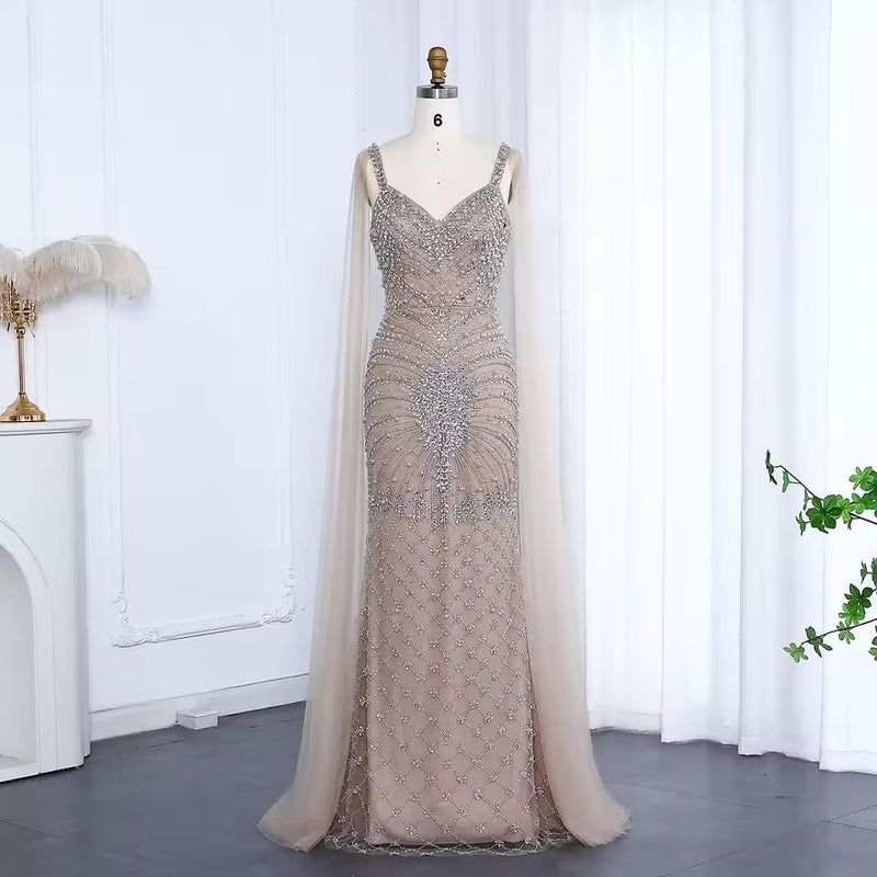 Turquoise Beaded Mermaid Evening Dress with Cape Sleeves SS028