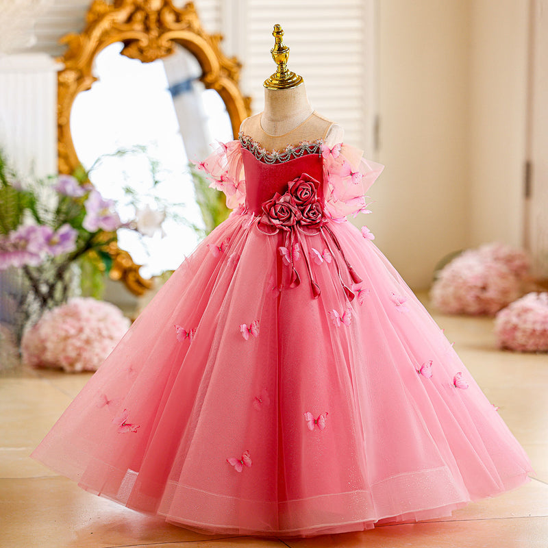 Butterfly Applique 3D Flowers Tulle Pink Girl Princess Dress J853