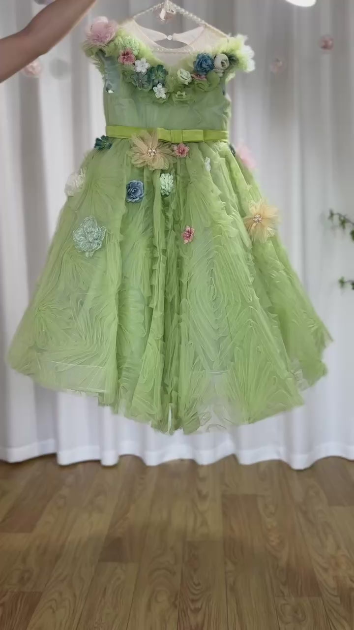 Indulge your little girl in luxury with the Jill Wish Dubai sage green princess gown. Handmade flowers and delicate pearls adorn the dress, making it perfect for special occasions like birthdays and weddings. Embrace elegance with this stunning addition to your child's wardrobe.