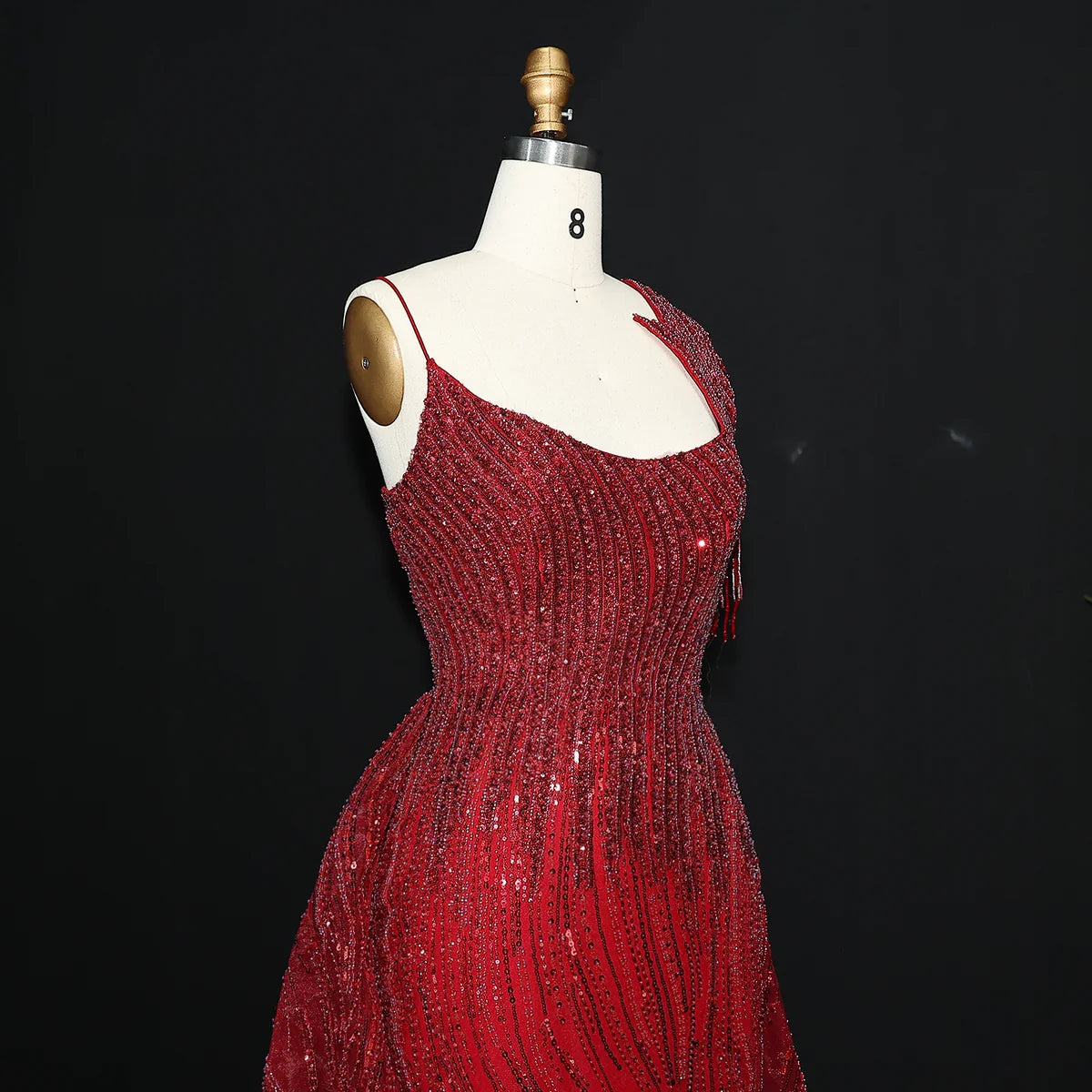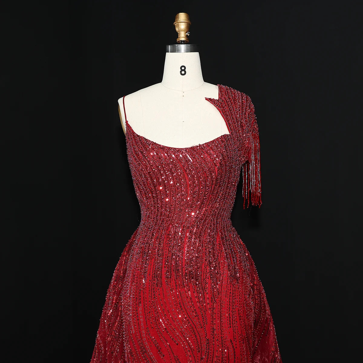 Luxury Beaded Tassel Red One Shoulder Evening Dress with Overskirt SS008
