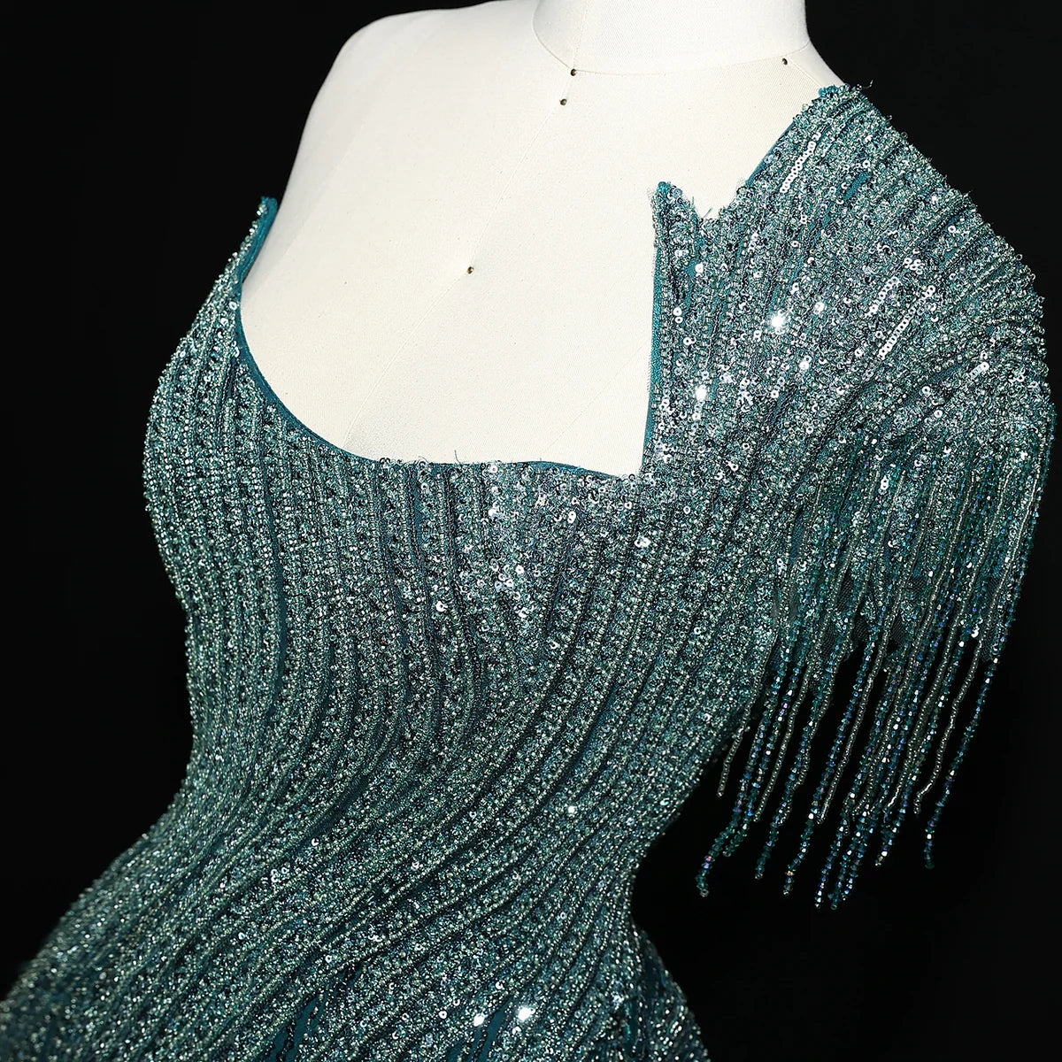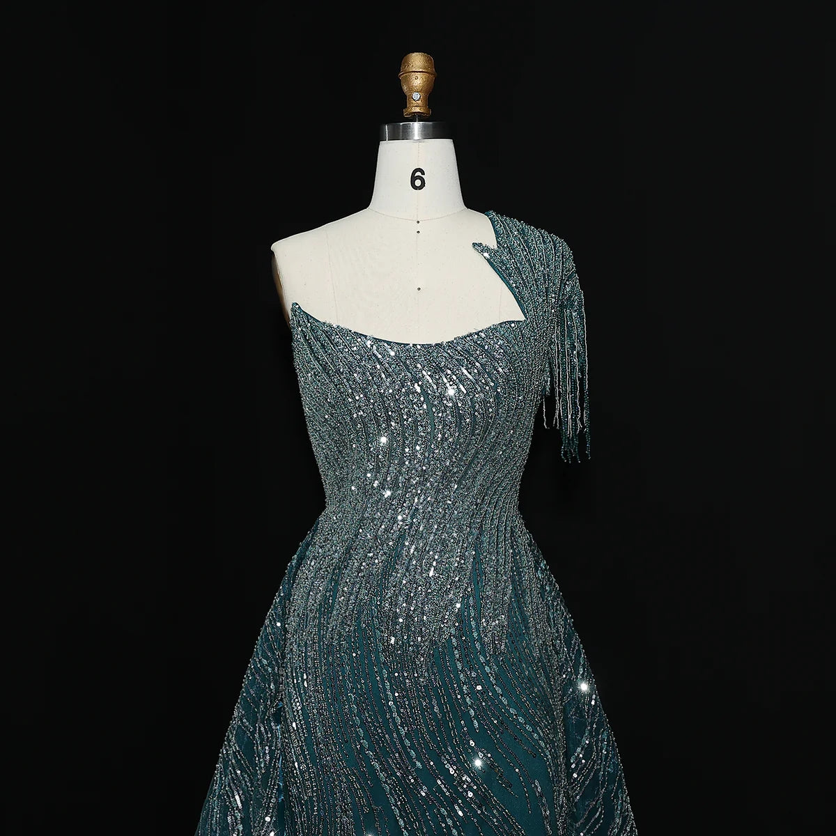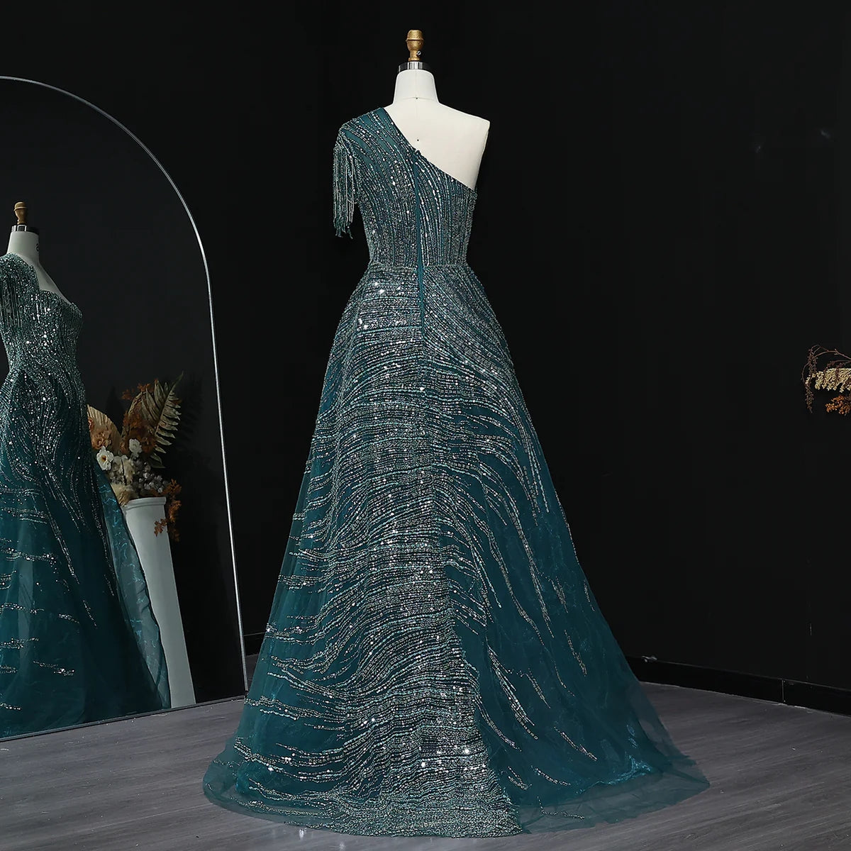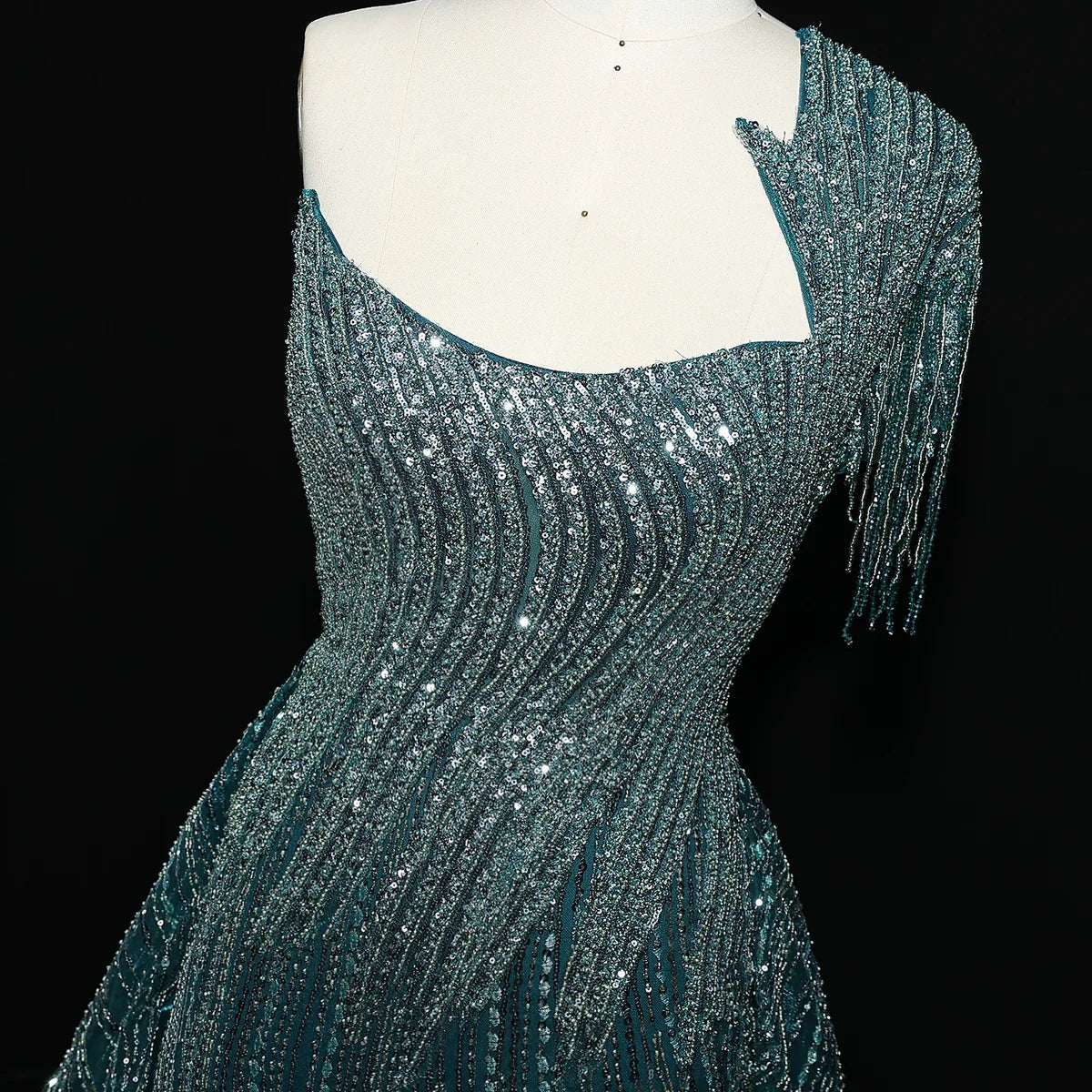 Introducing our luxurious one shoulder evening dress, adorned with intricate beadwork and a stunning tassel design. Made from high-quality materials, this dress is both comfortable and elegant. Perfect for any special occasion, the added overskirt adds drama and sophistication. Elevate your style with this statement piece.