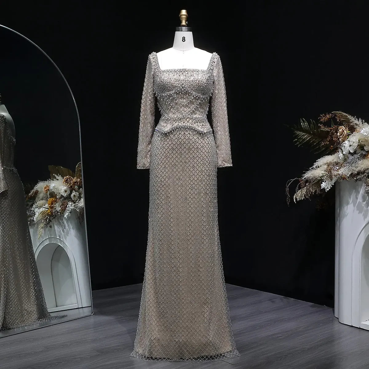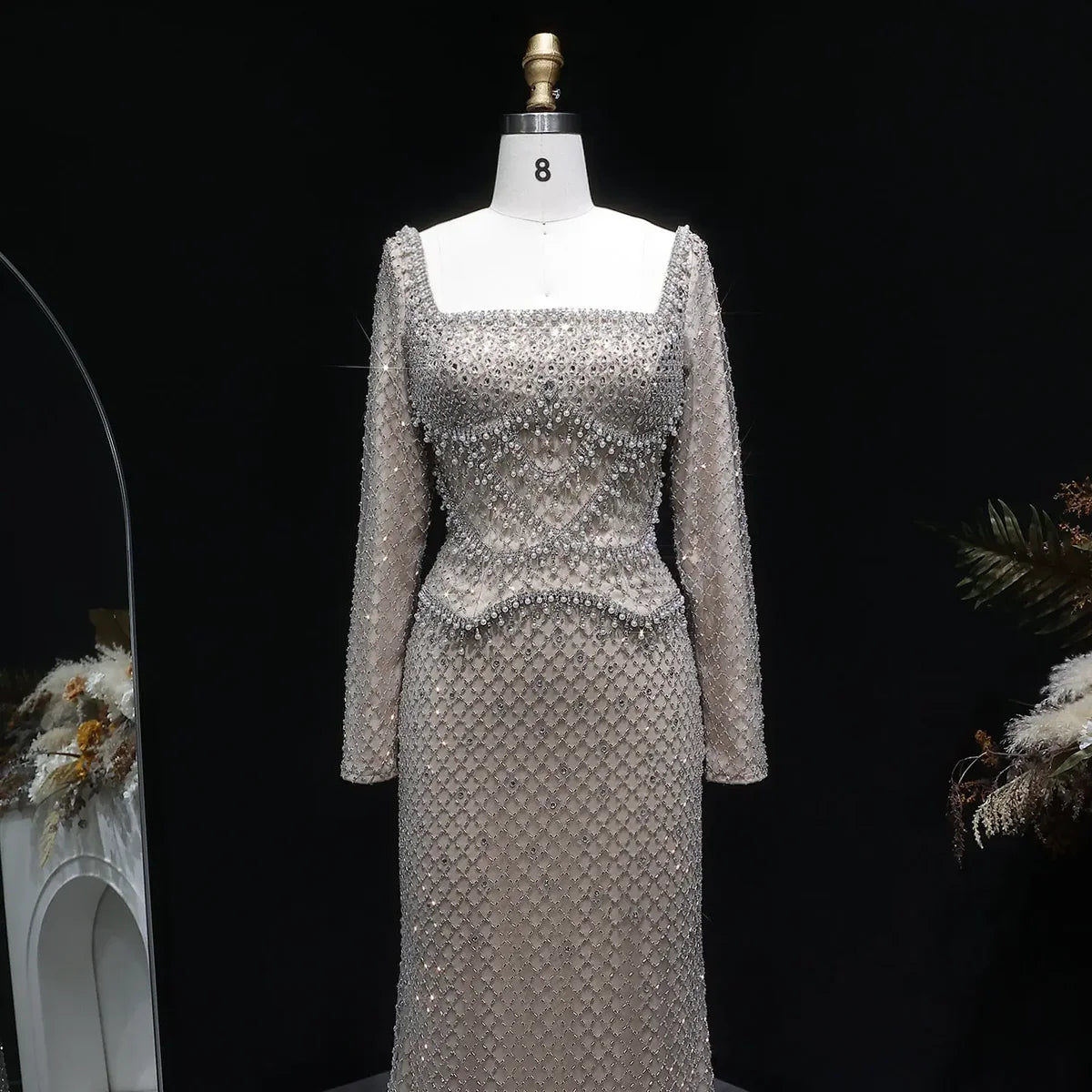 Elegant Gray Square Neck Crystal Evening Dress with Long Sleeves SS633