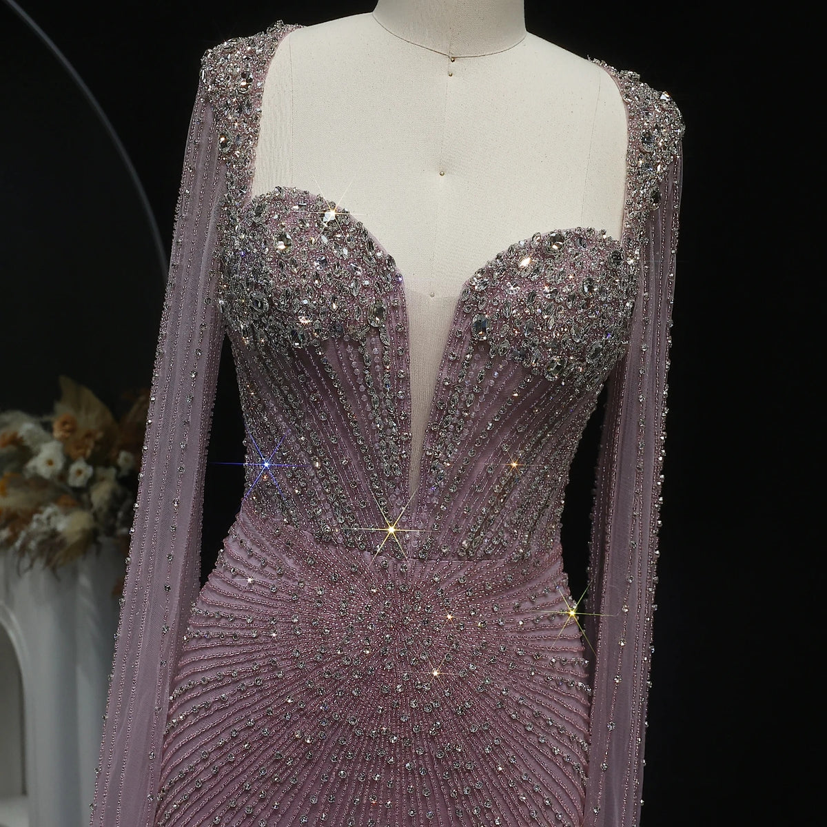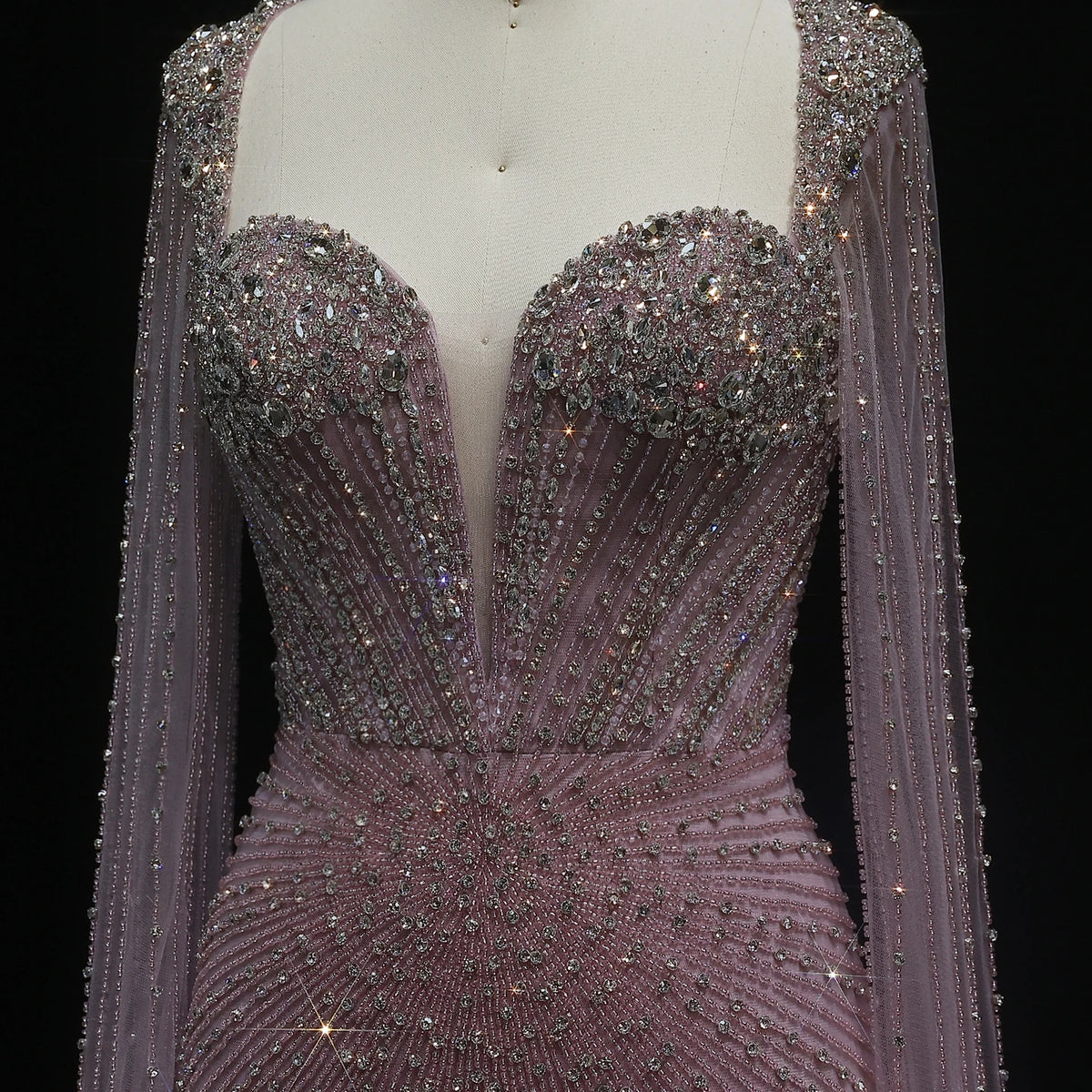 Beaded Nude Dubai Dress with Cape Sleeves Pink Arabic Gown SS194