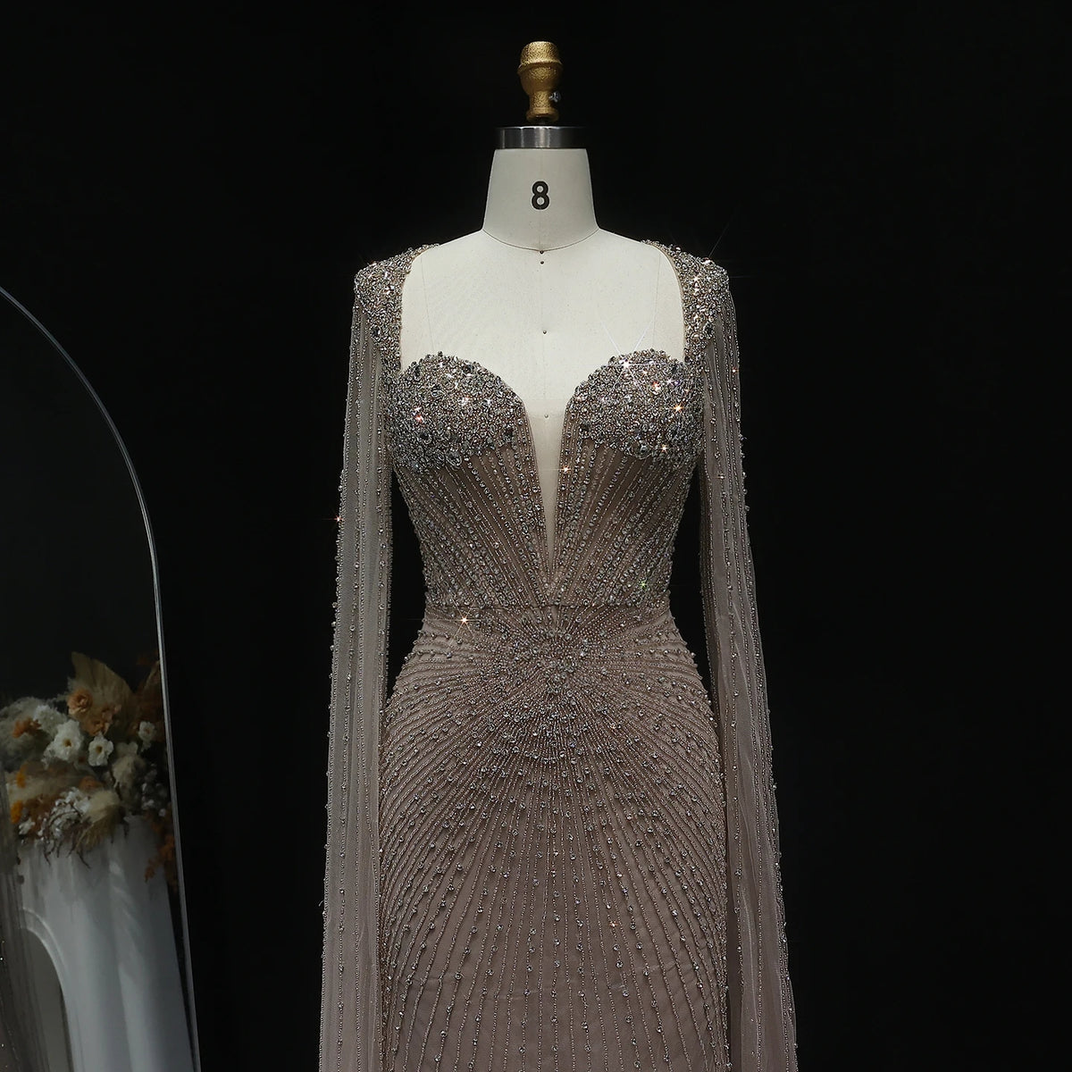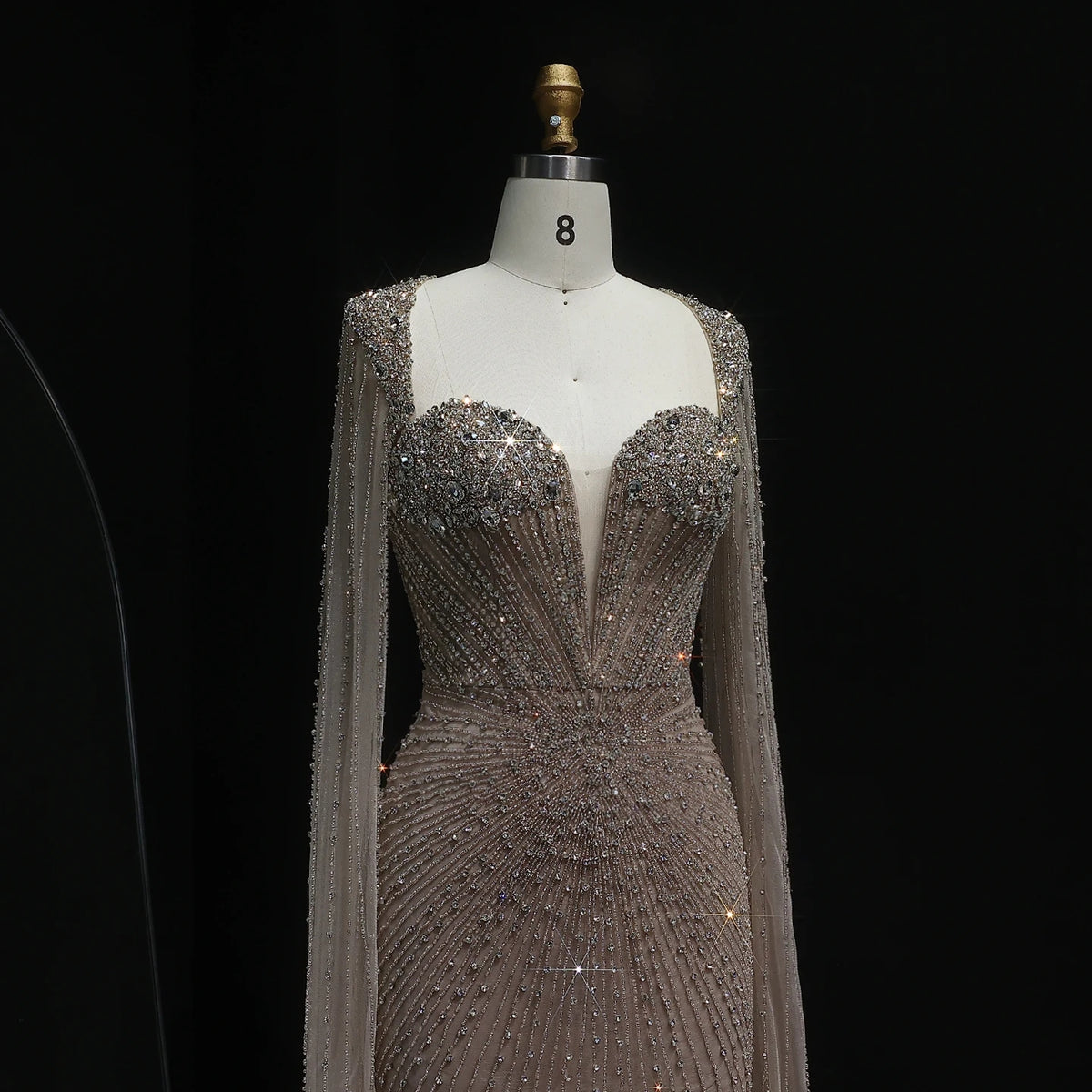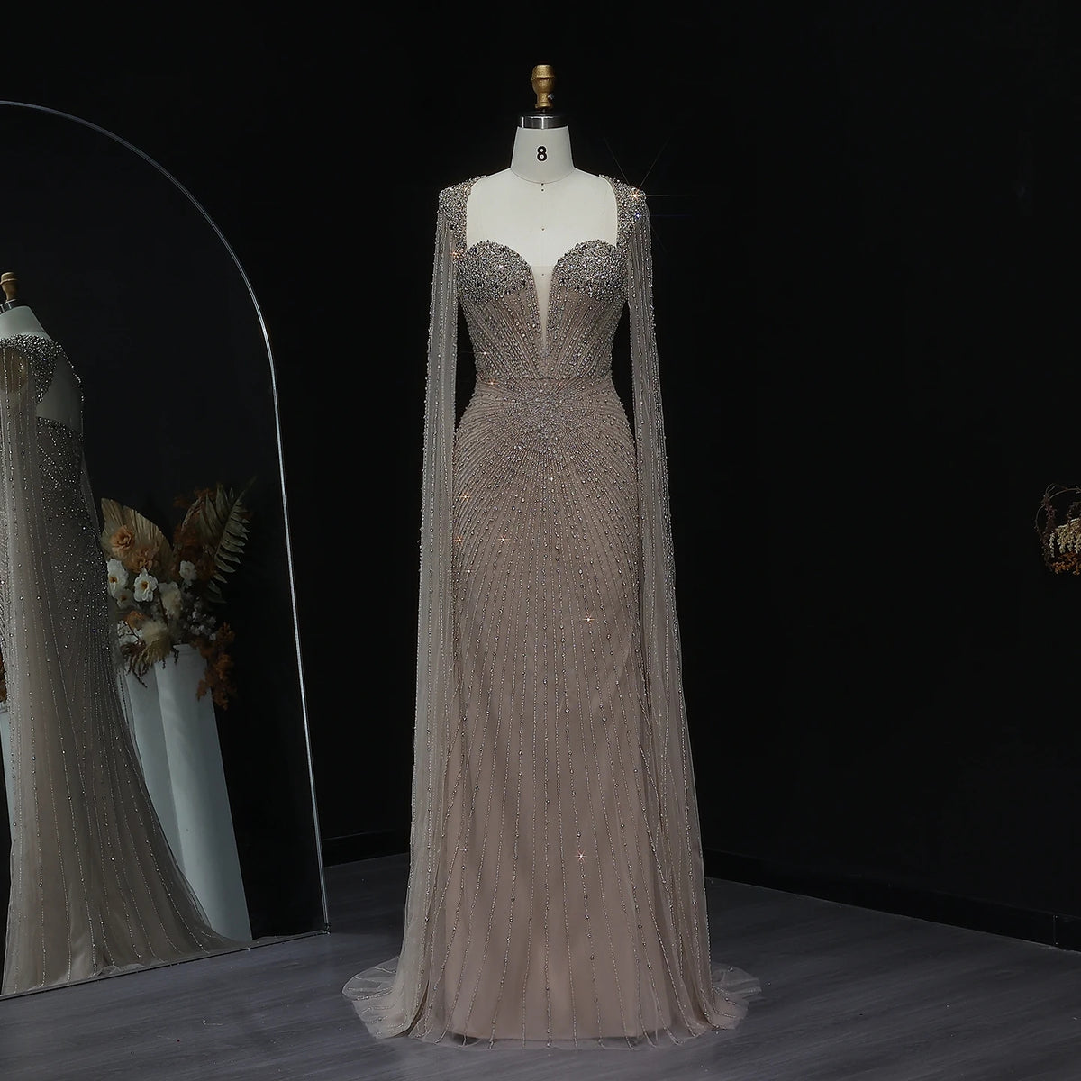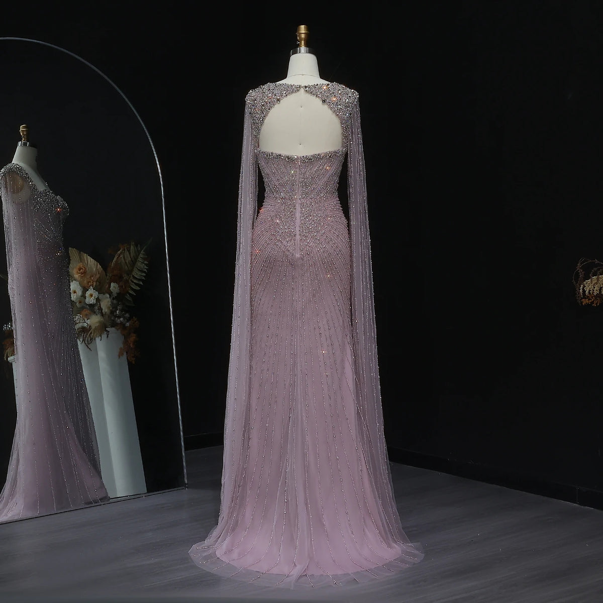 This stunning Beaded Nude Dubai Dress with Cape Sleeves Pink Arabic Gown SS194 features intricate beadwork and flowing cape sleeves. Perfect for any formal occasion, this dress effortlessly combines elegance and modesty. The lightweight fabric ensures comfort while the beading adds a touch of glamour.