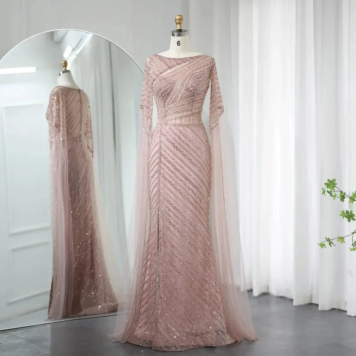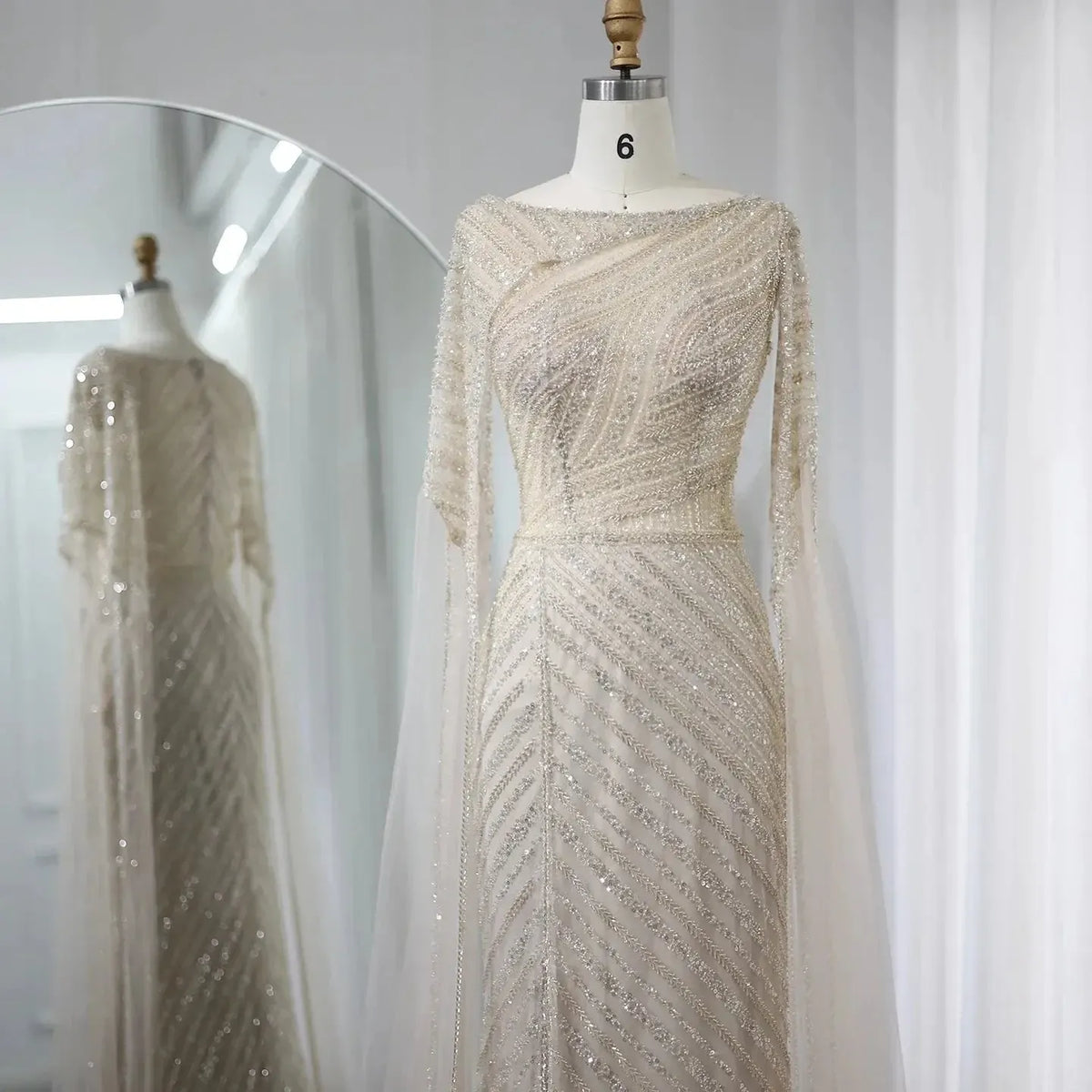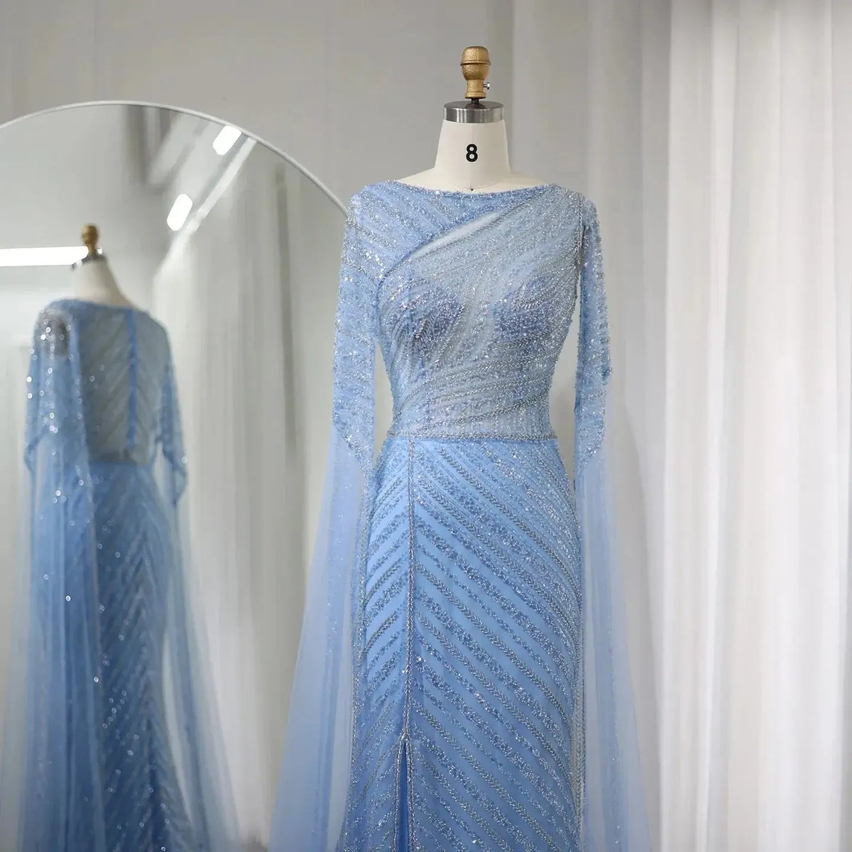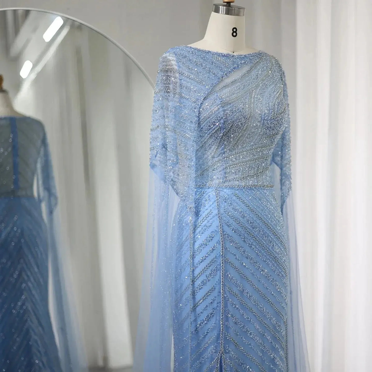 Arabic Mermaid Blue Dubai Evening Dress with Cape Sleeves Luxury Wedding Party Gowns SS087