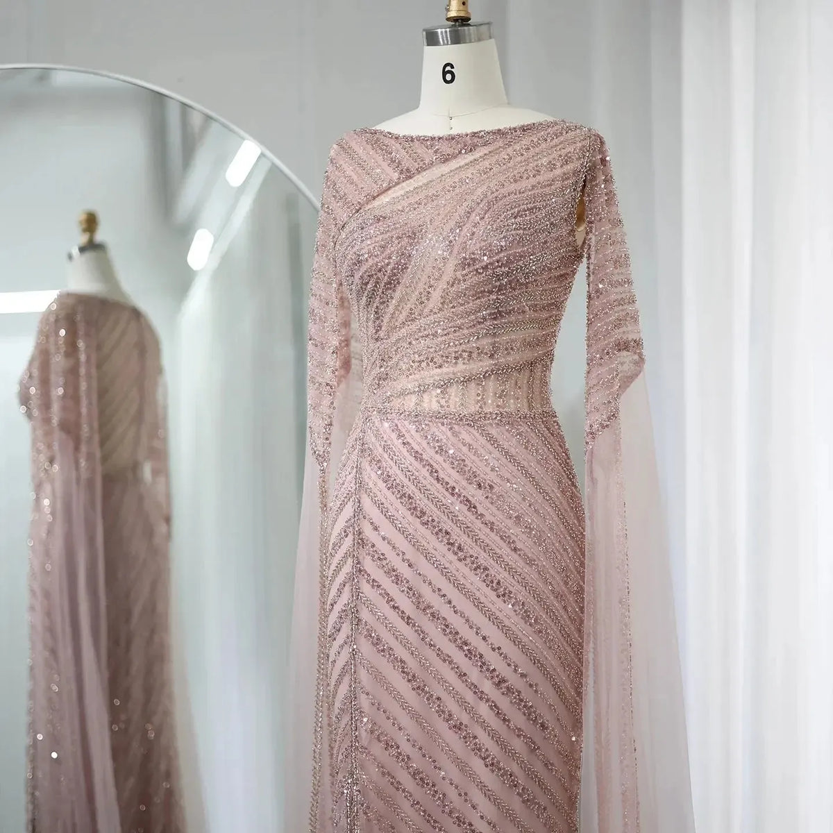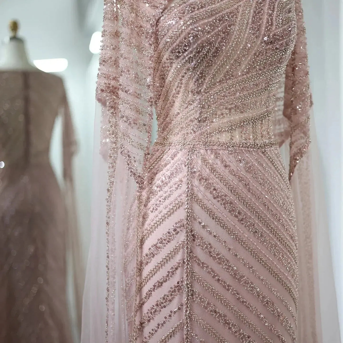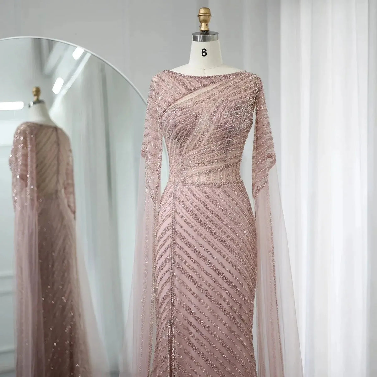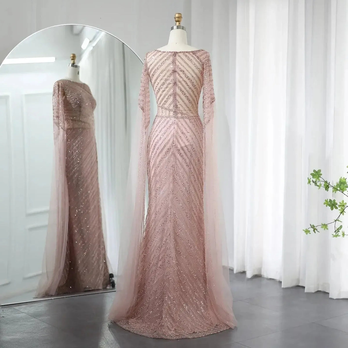 Arabic Mermaid Blue Dubai Evening Dress with Cape Sleeves Luxury Wedding Party Gowns SS087