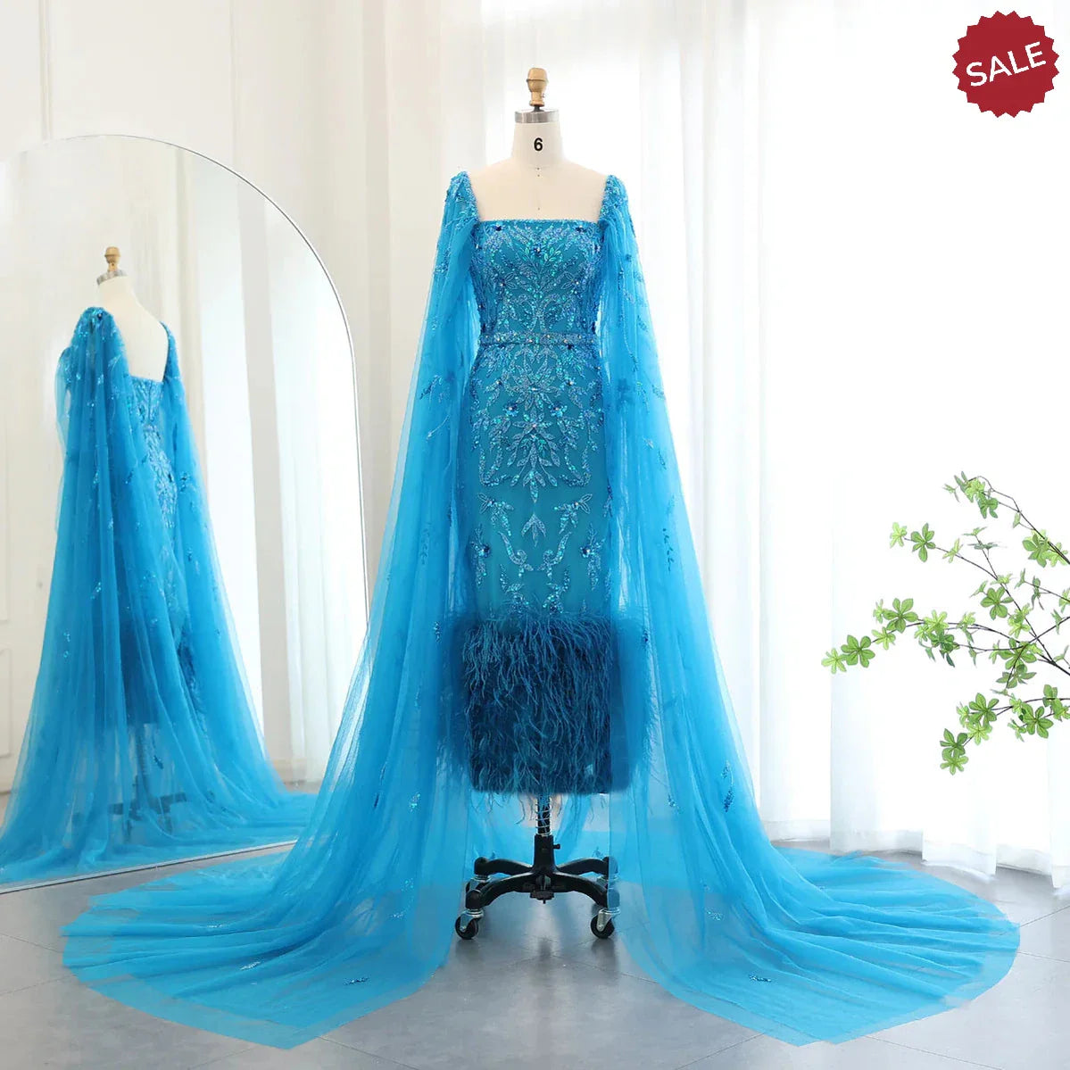 Elevate your wedding party attire with the Dreamy Vow Dubai Luxury Evening Dress. Elegant lilac feathers and cape sleeves add a touch of luxury, while the ankle-length midi cut complements any body type. Perfect for a glamorous Arabic wedding, this gown will make you feel like royalty.