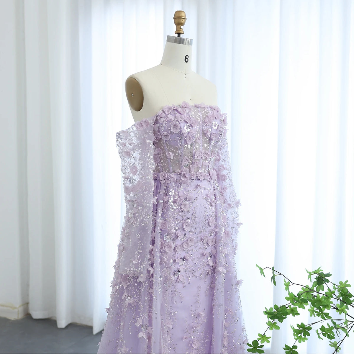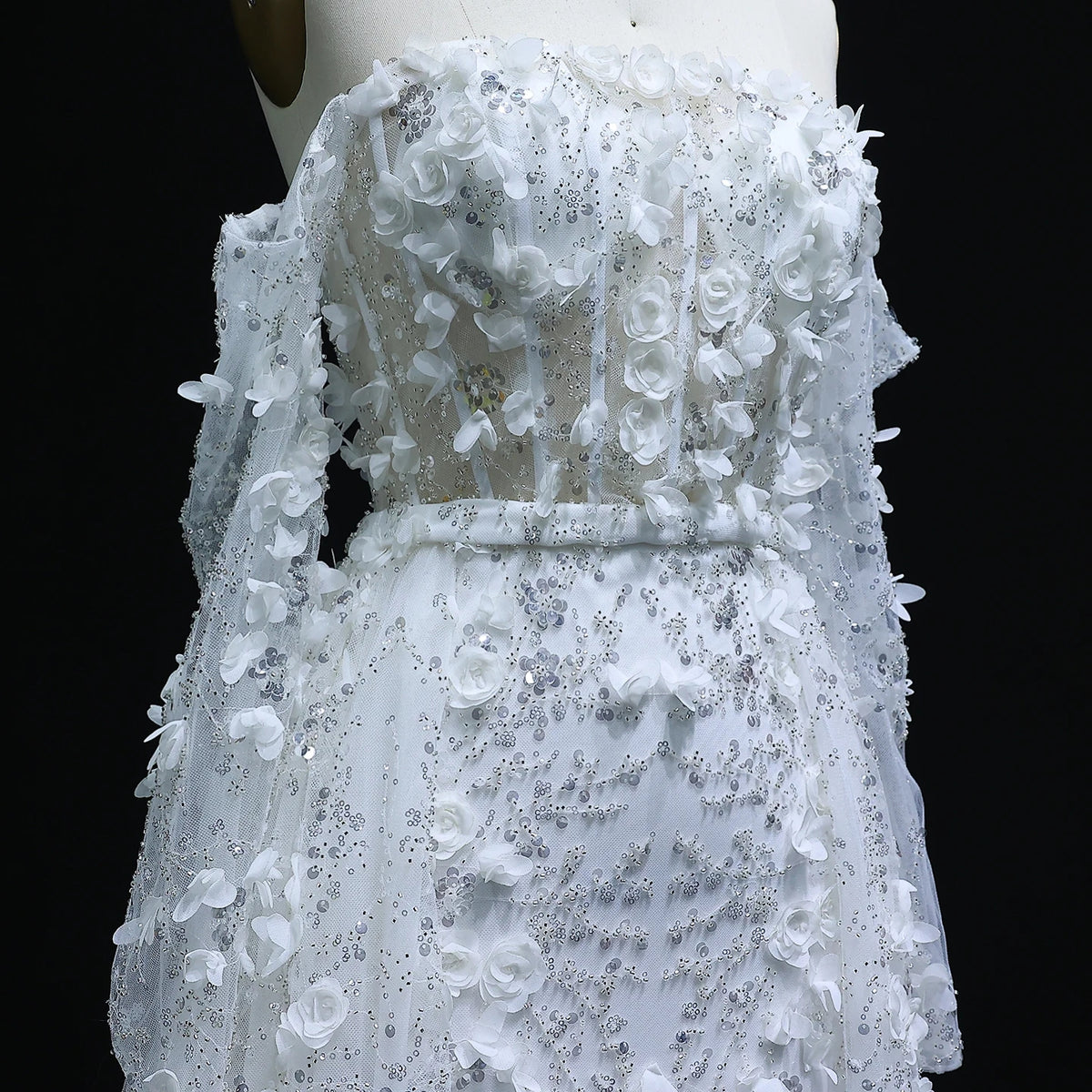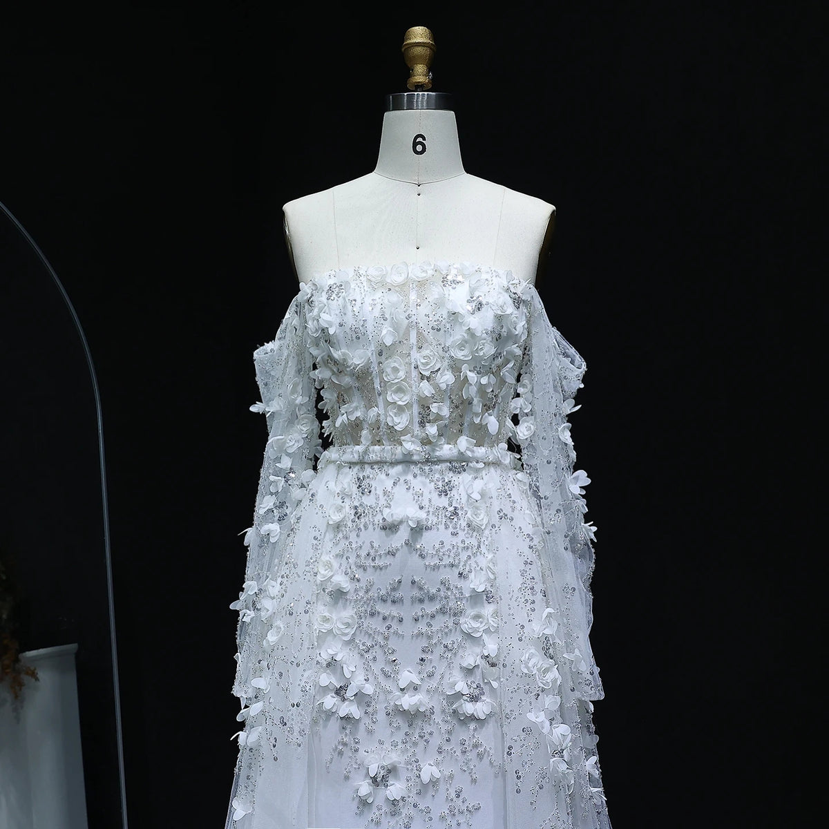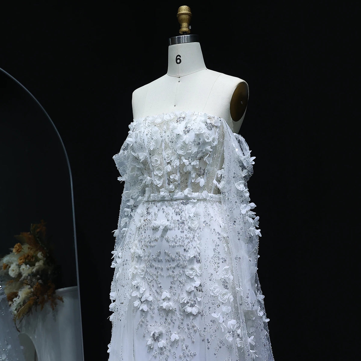 This elegant evening dress features stunning 3D flower embellishments in a soft pink hue, adding a touch of romance to your look. The overskirt adds an extra layer of sophistication, creating a graceful silhouette. Perfect for a special occasion, this dress will make you stand out in style.