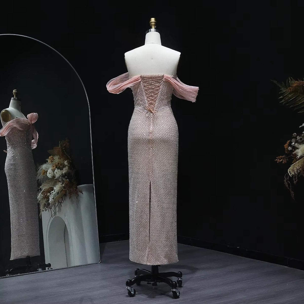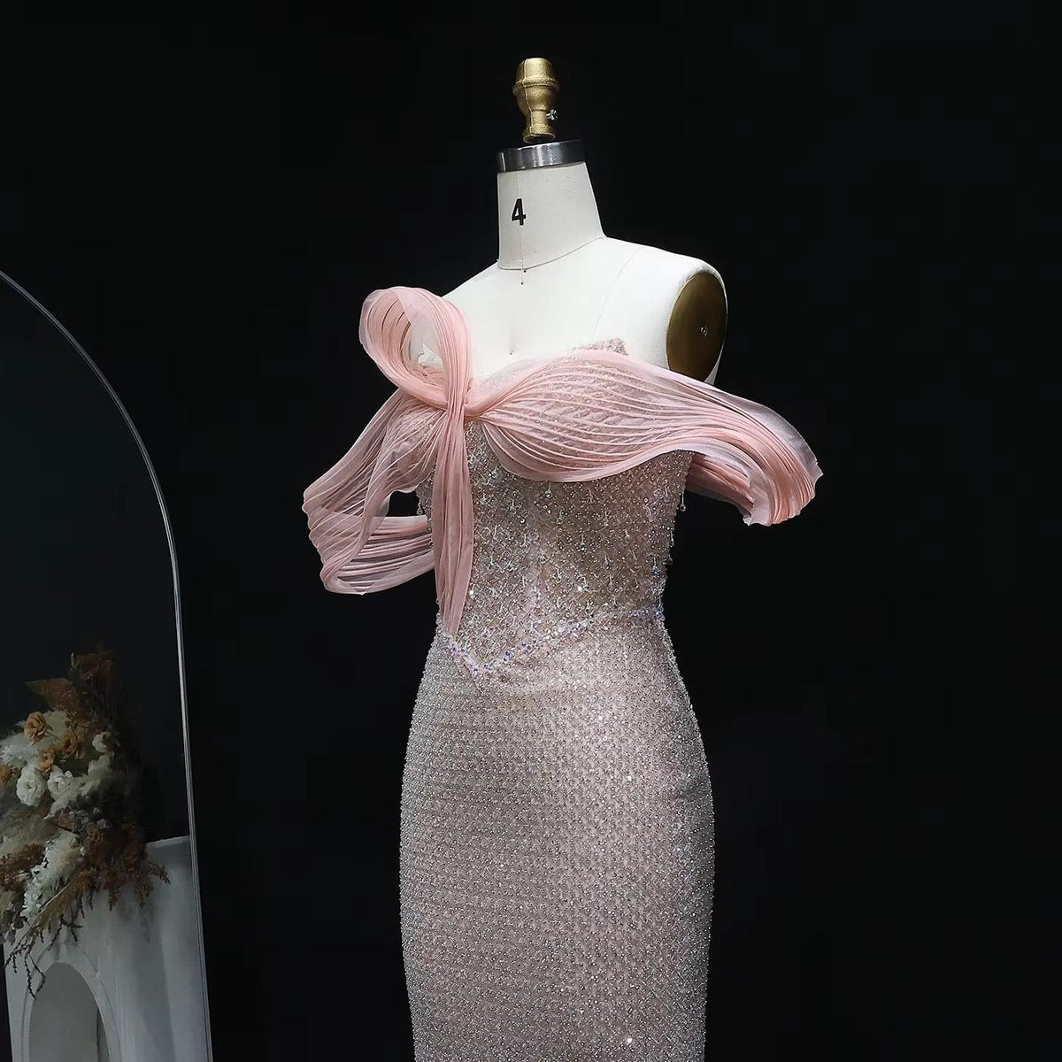 Elegant Off Shoulder Embroidery Blush Pink Evening Dress SS721