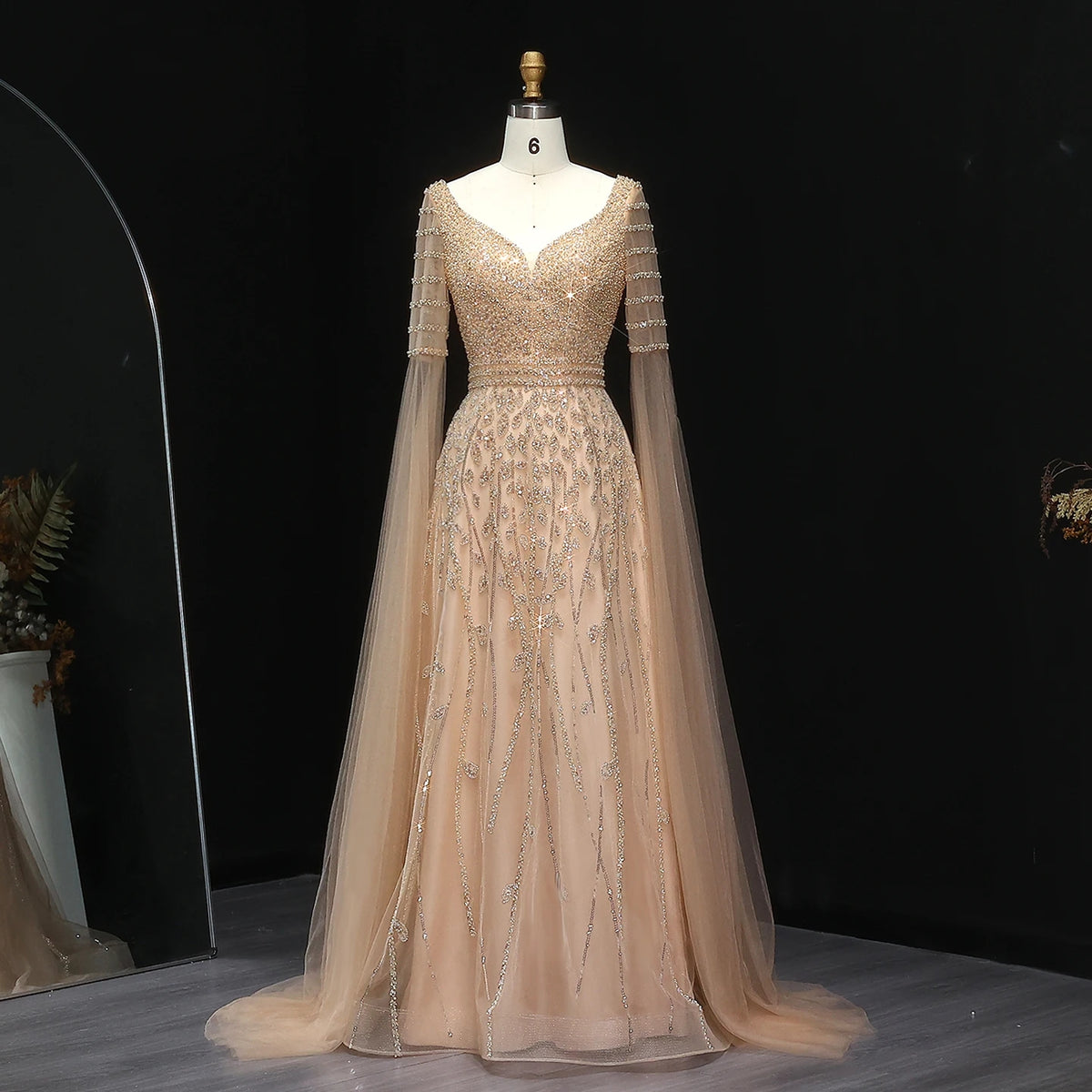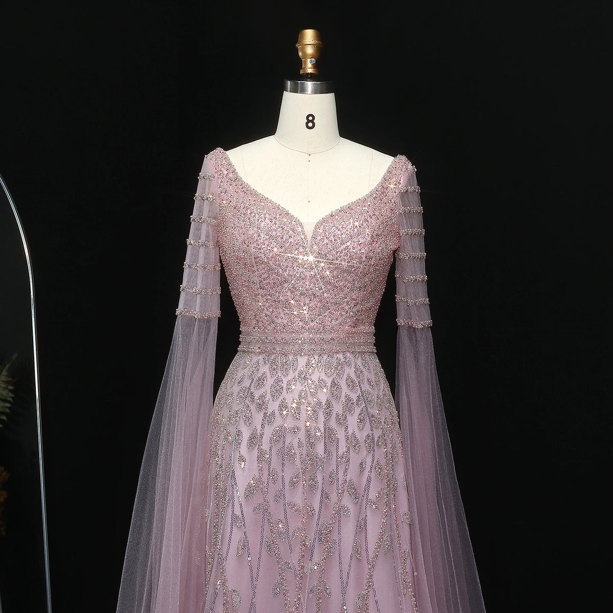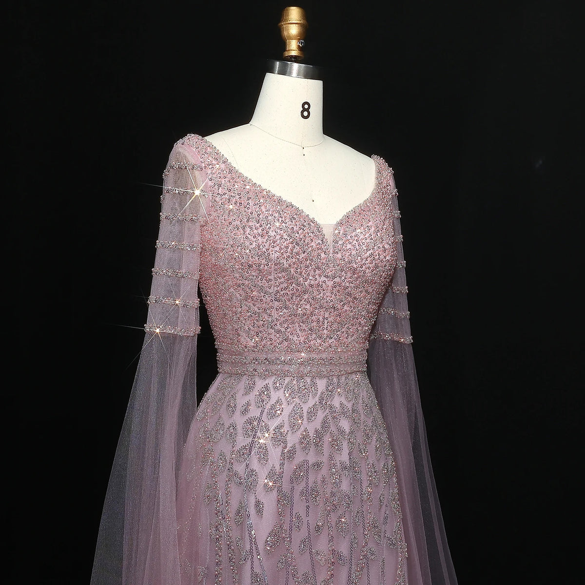 Elegant Pink Beaded Evening Gown with Cape Sleeves SS034