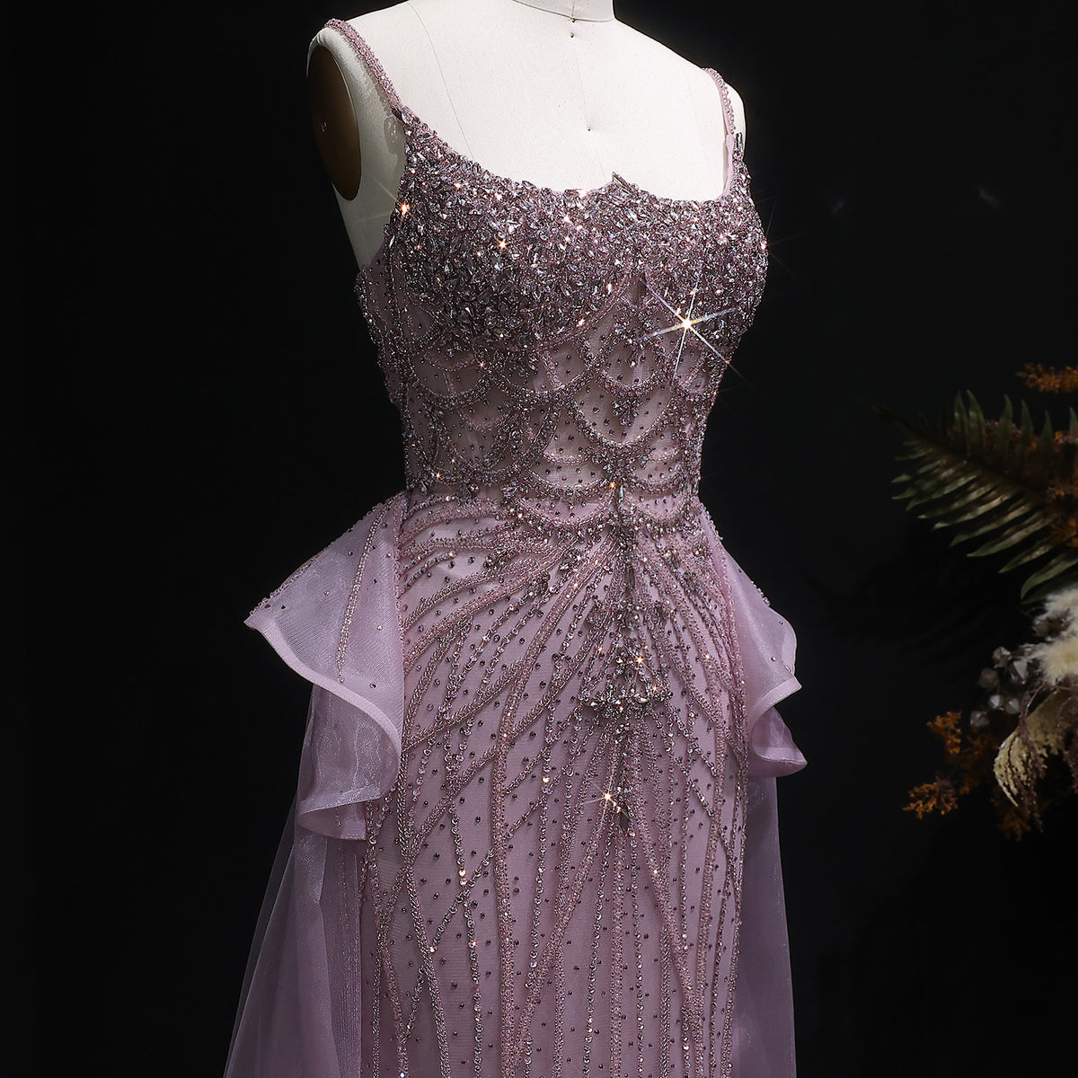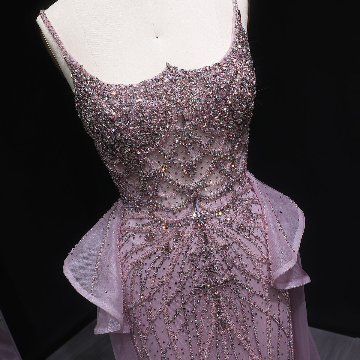 Luxury Champagne Beaded Spaghetti Strap Evening Dress SS026