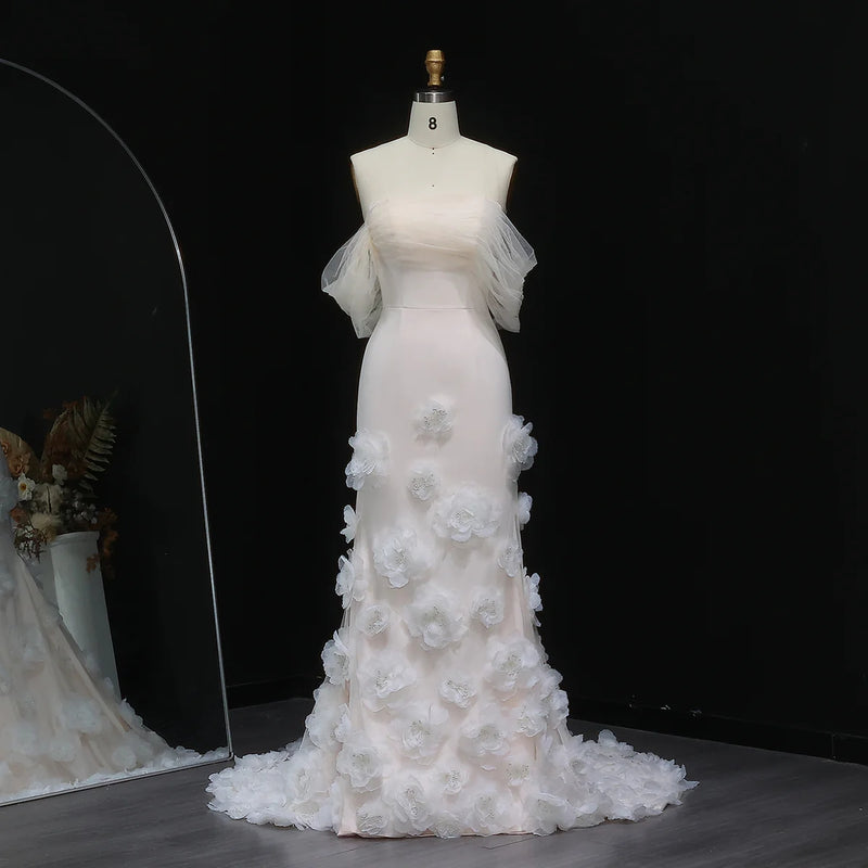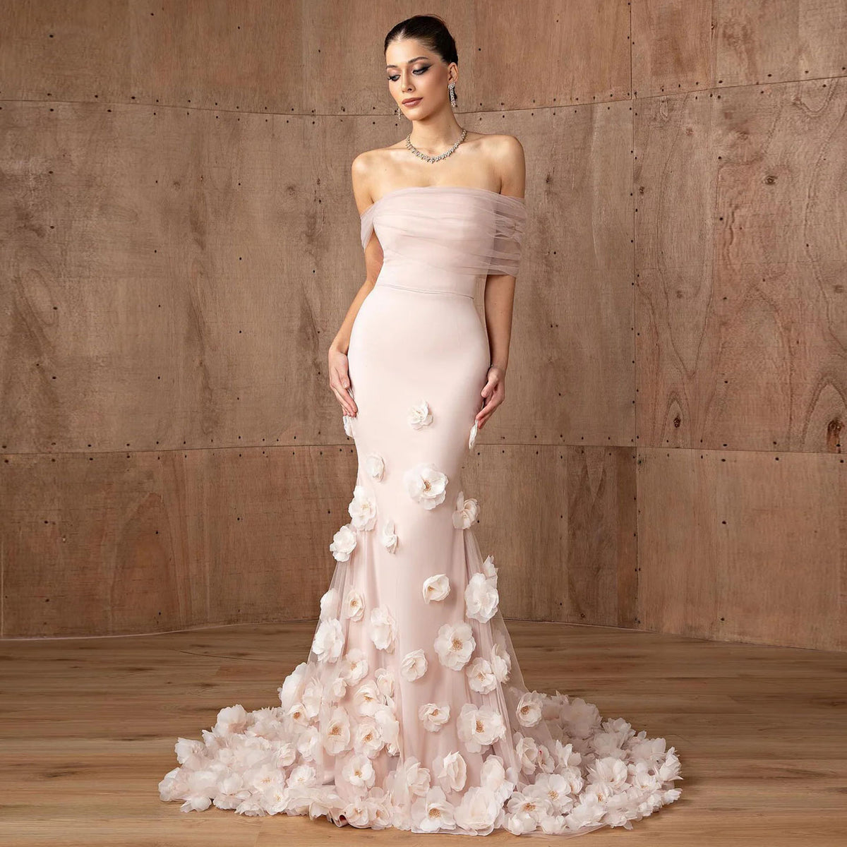 Luxury 3D Flowers Blush Pink Satin Mermaid Evening Dress Elegant Off Shoulder SS464