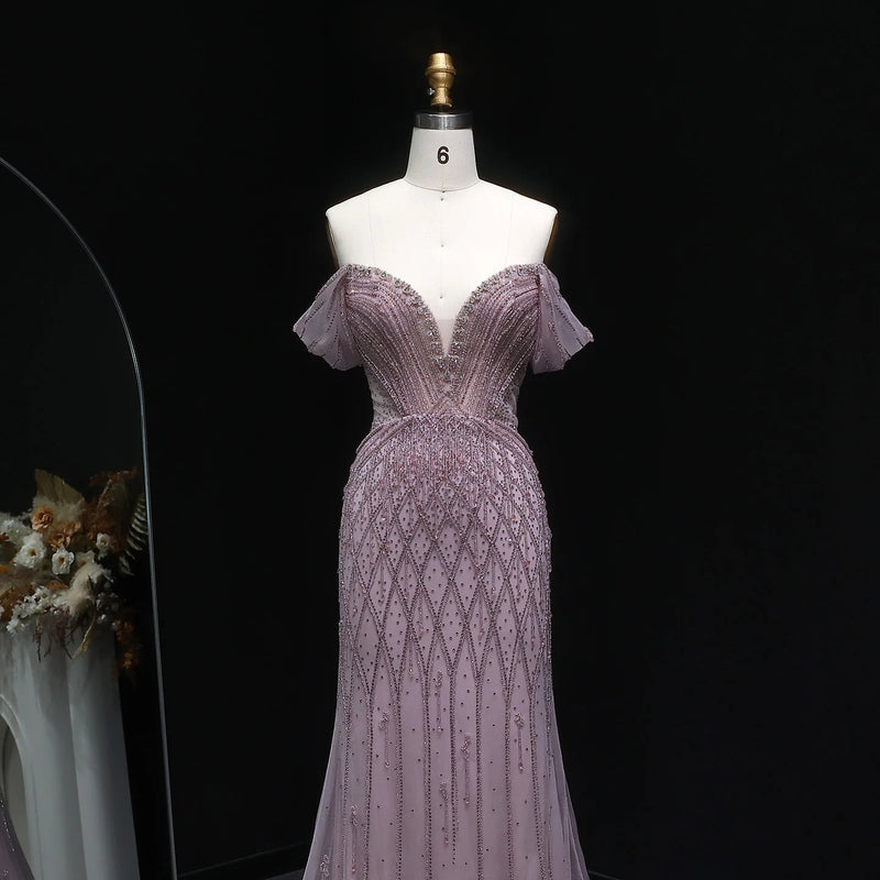 Elegant Off-Shoulder Beaded Evening Gown SS109