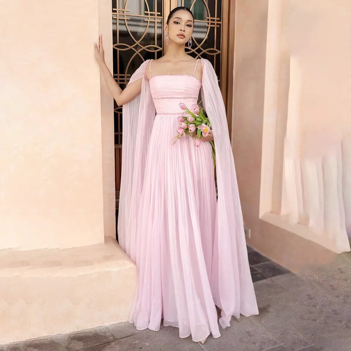 Elegant Pink Beaded Evening Gown with Cape Sleeves SS034