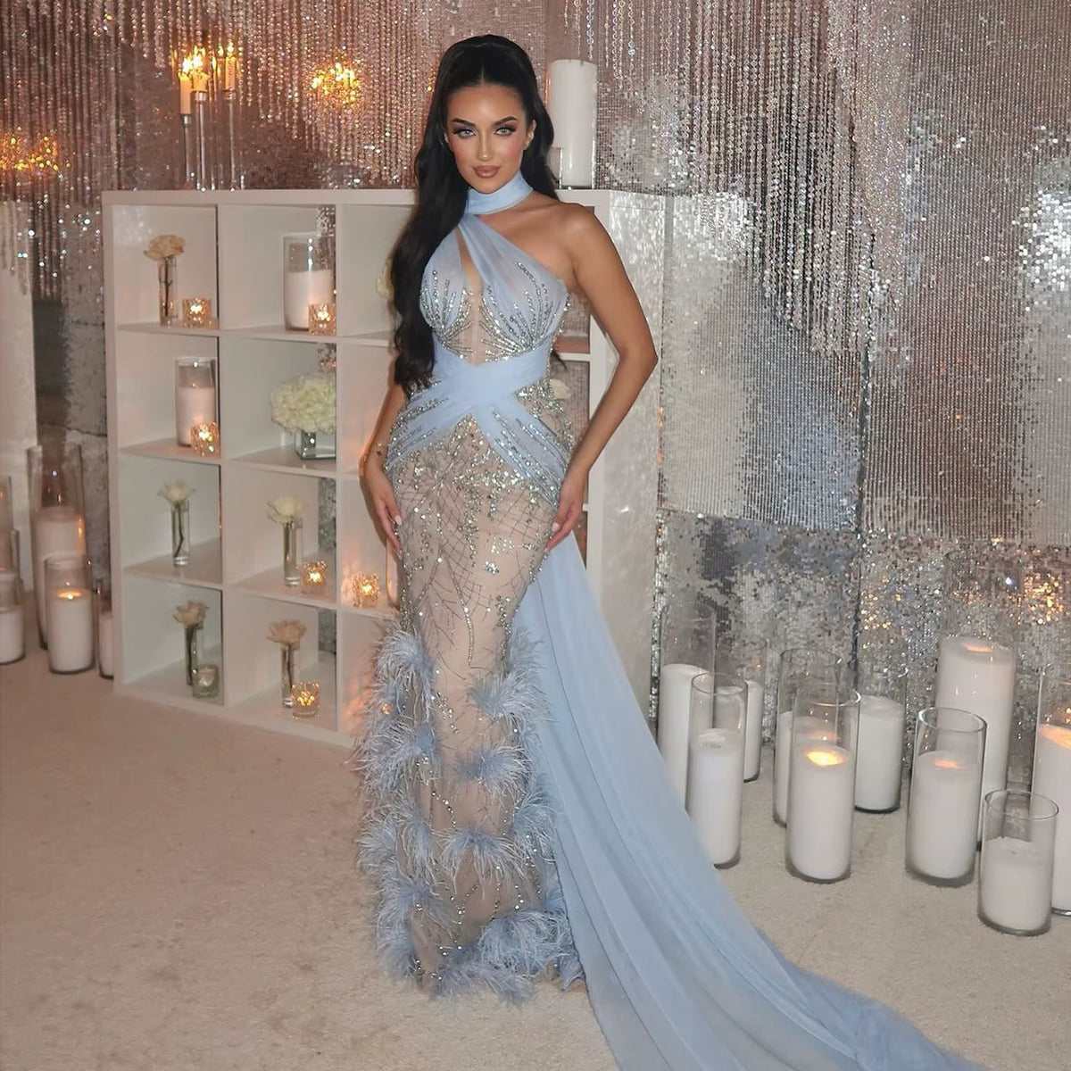 Glamorous Halter Beaded Evening Dress with Feather Flowing Overskirt SS576