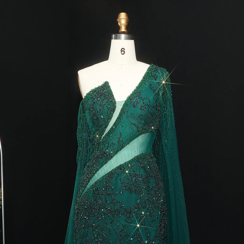 Green Luxury Beaded Evening Dress with Flowing Long Cape SS156
