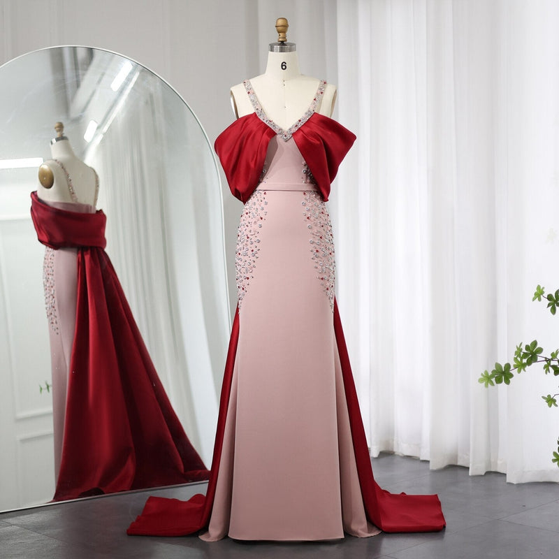 Luxury Arabic Pink Burgundy Mermaid Evening Dress with Cape SS446