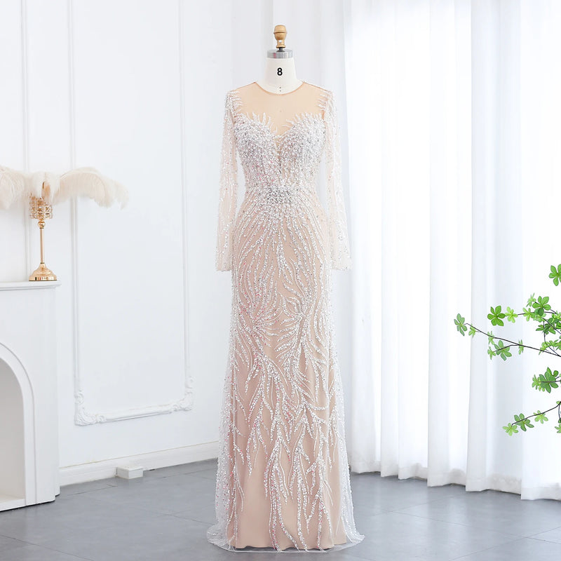 Luxury Dubai White Nude Mermaid Evening Dresses Long Sleeve SS684