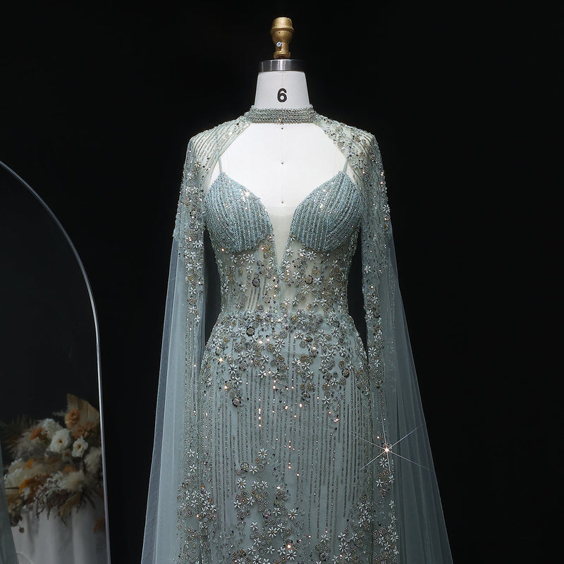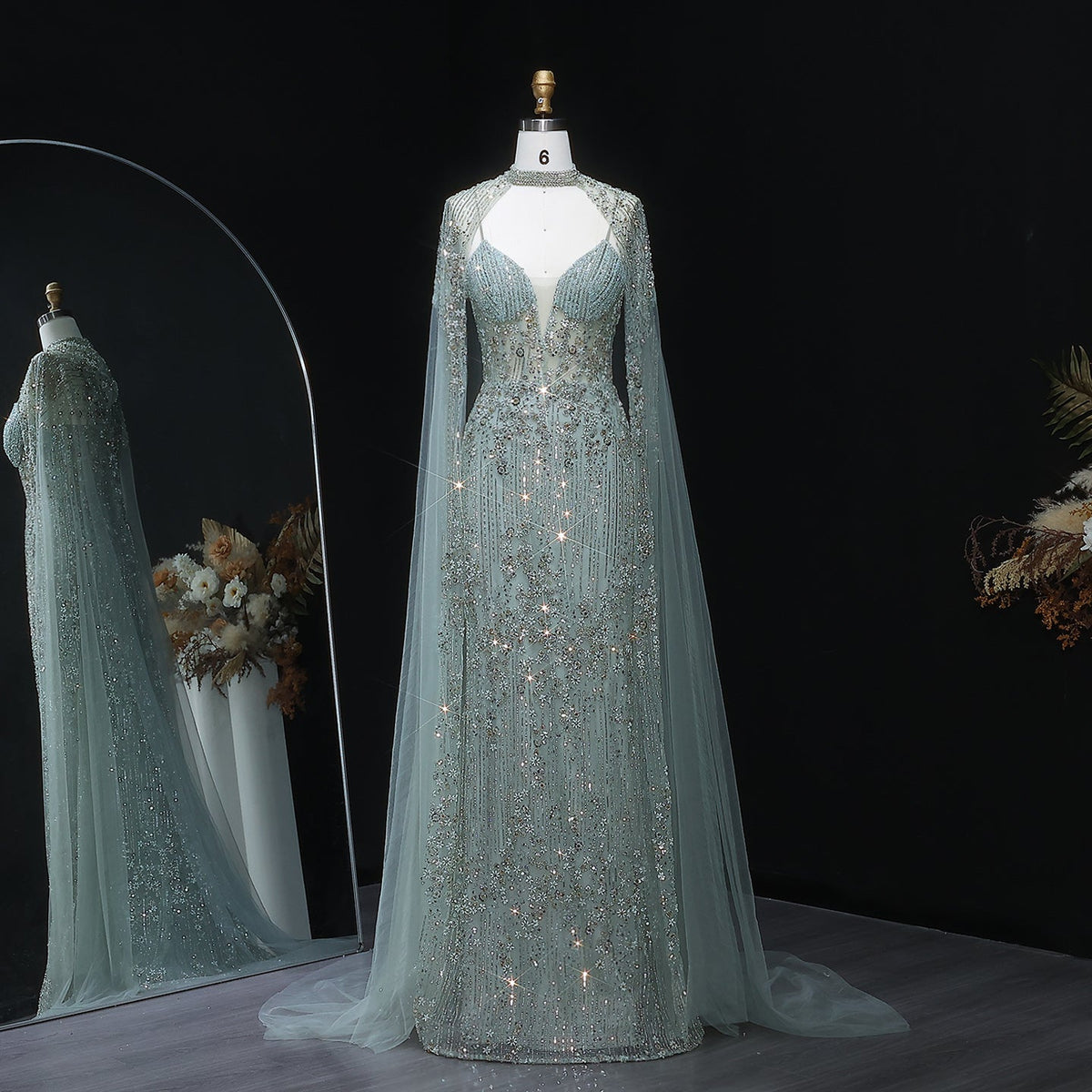 Saudi Arabia Sage Green Long Evening Dress with Cape Sleeves SS086