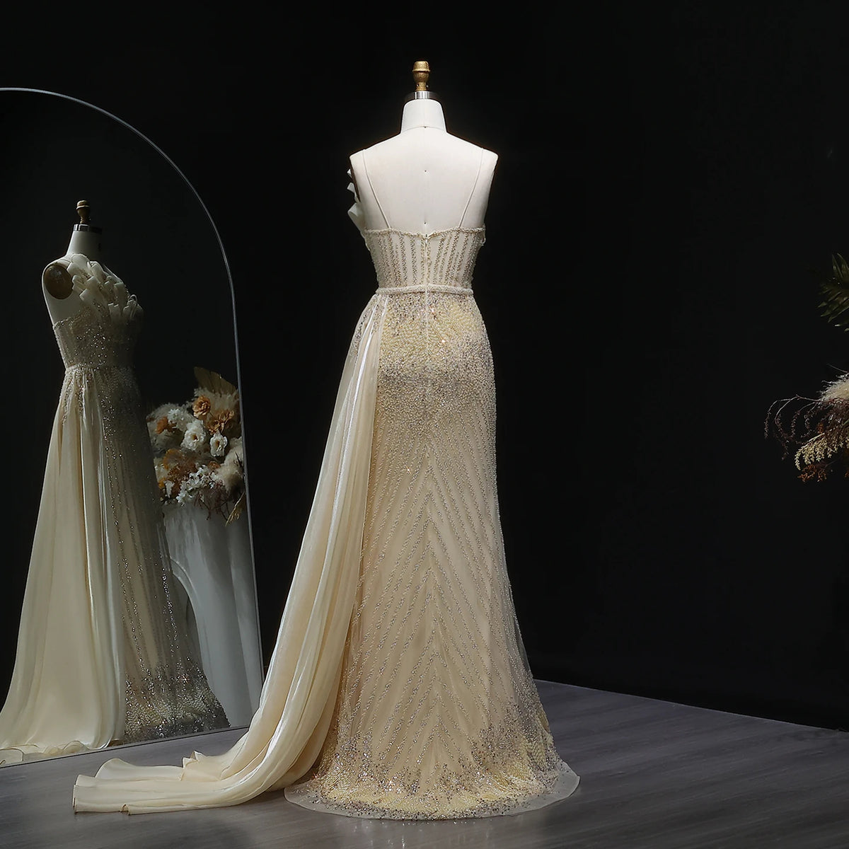 Luxury Mermaid Evening Dress with Beaded Details and Dramatic Overskirt SS094