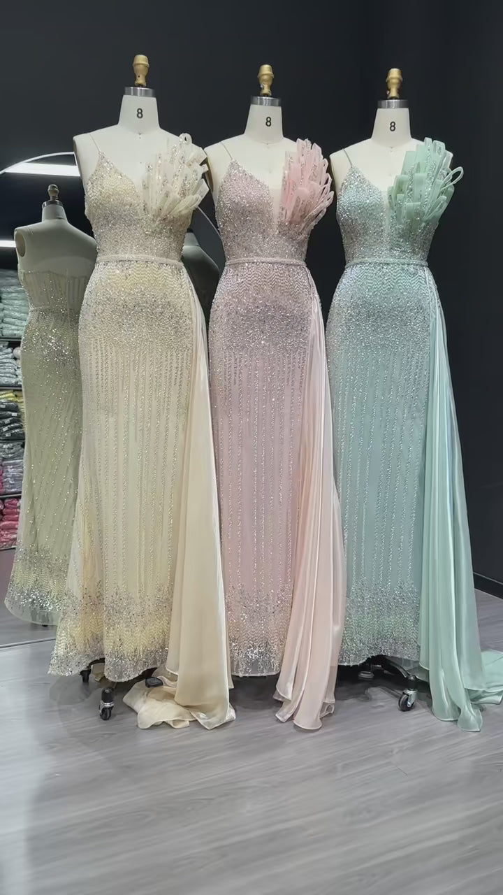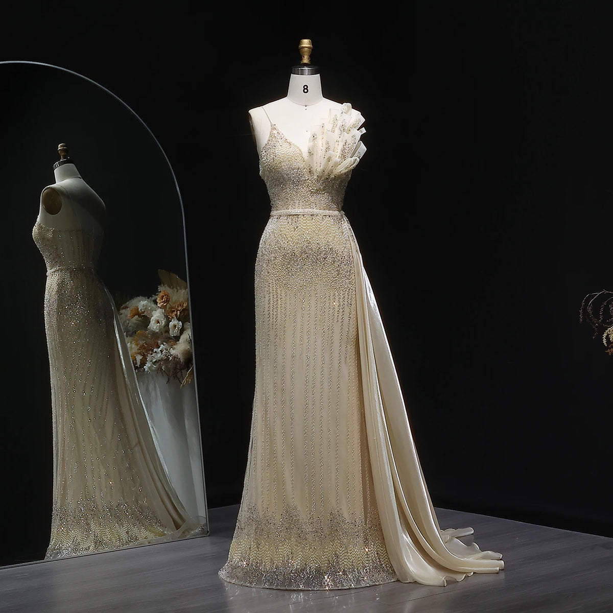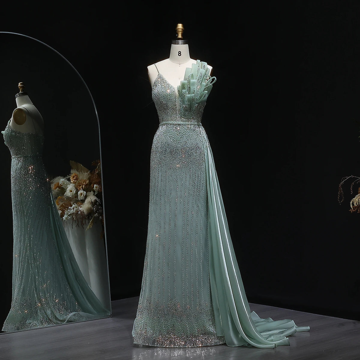 This Luxury Mermaid Evening Dress blends classic elegance with modern drama. Detailed with exquisite beadwork, the fitted silhouette accentuates your curves while the dramatic overskirt adds volume and movement for a captivating presence. Perfect for upscale occasions, this dress offers both refined craftsmanship and a statement-making design.