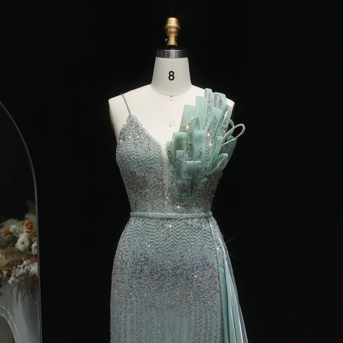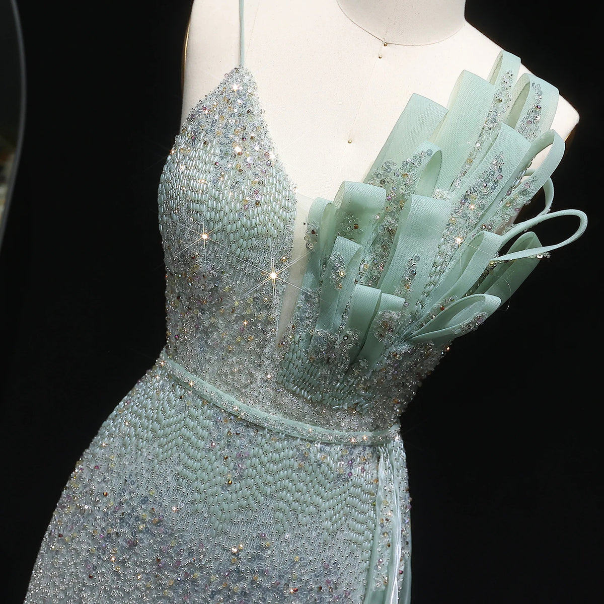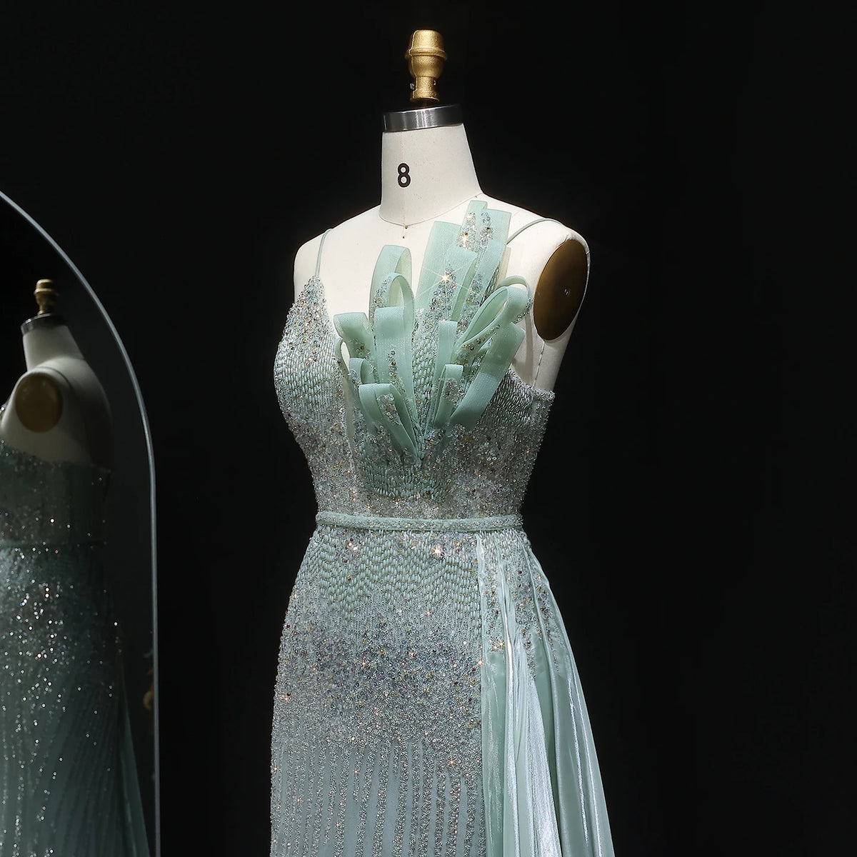 This Luxury Mermaid Evening Dress blends classic elegance with modern drama. Detailed with exquisite beadwork, the fitted silhouette accentuates your curves while the dramatic overskirt adds volume and movement for a captivating presence. Perfect for upscale occasions, this dress offers both refined craftsmanship and a statement-making design.
