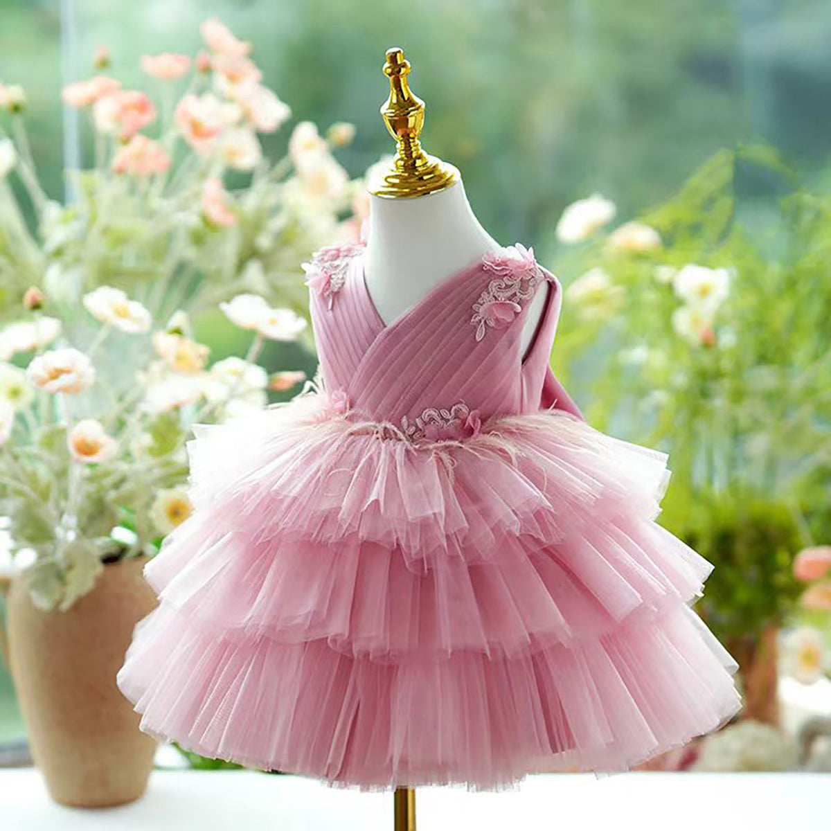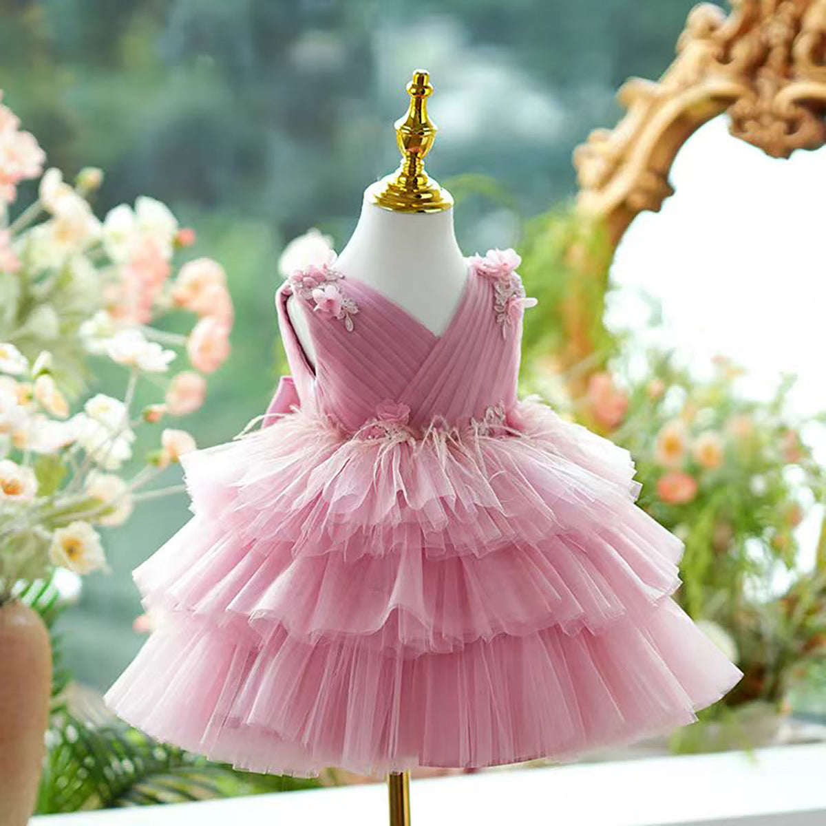 Sleeveless Applique Feathers Tiered Tulle Flower Girl Dress D069