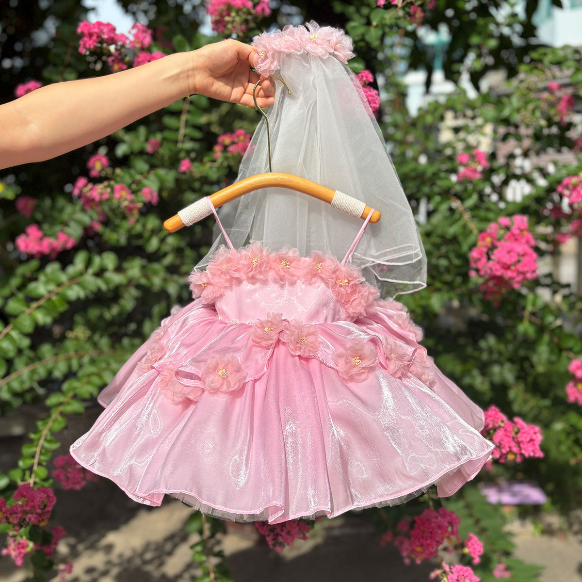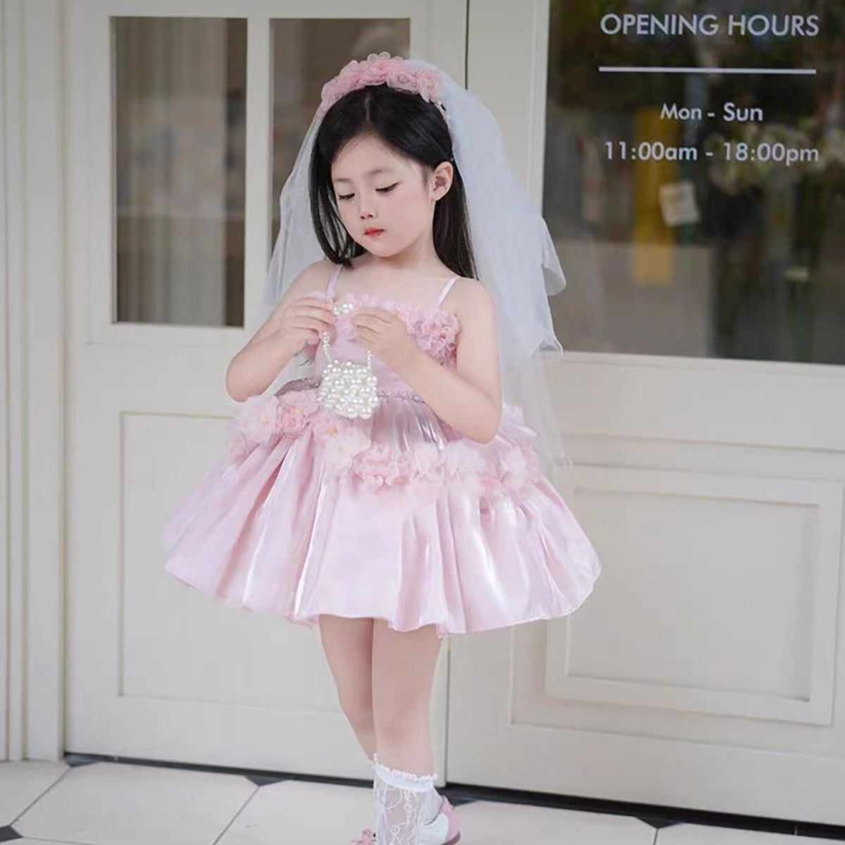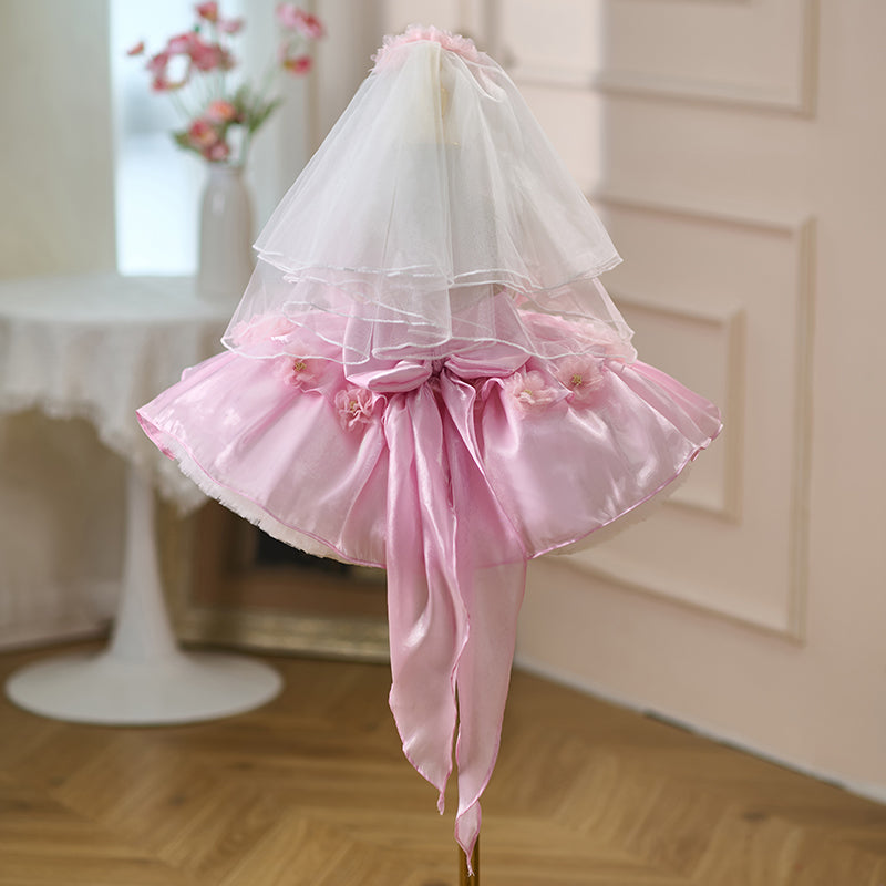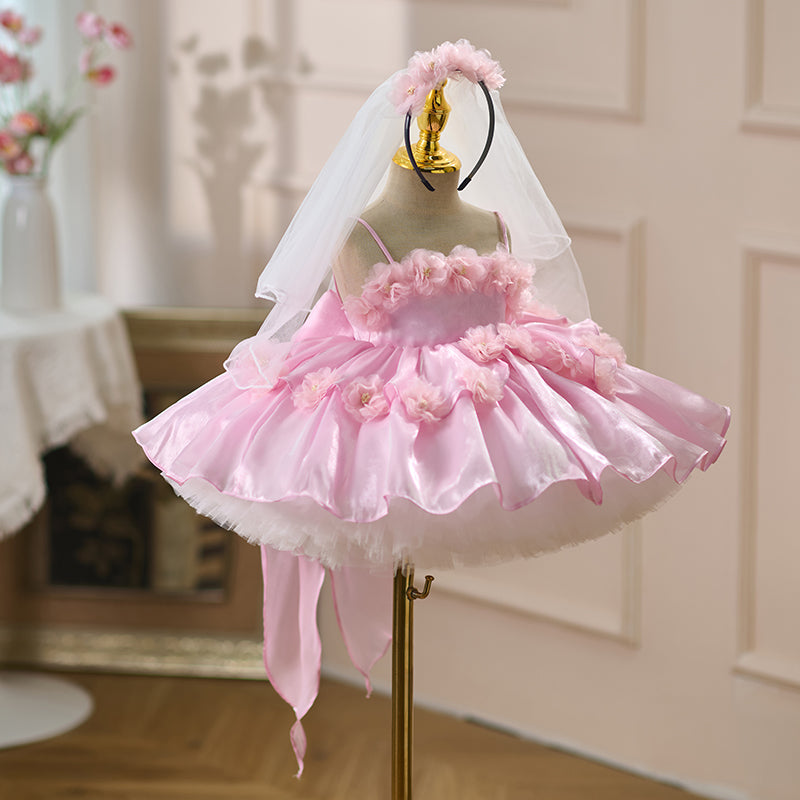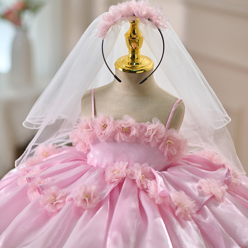 Sling Pearls Satin Pink Flower Girl Dress with Headwear D083