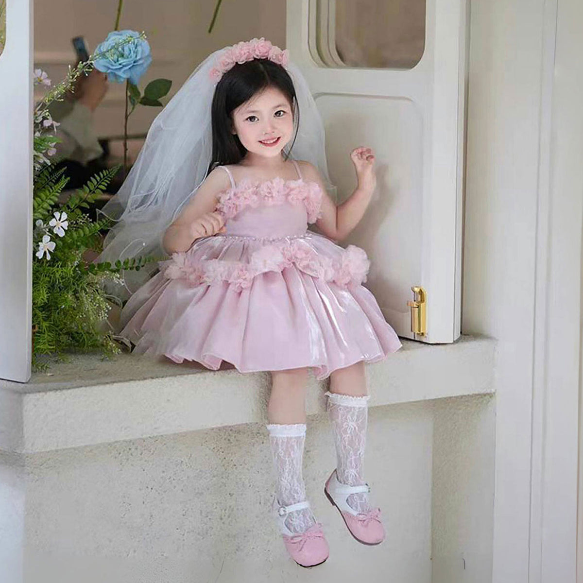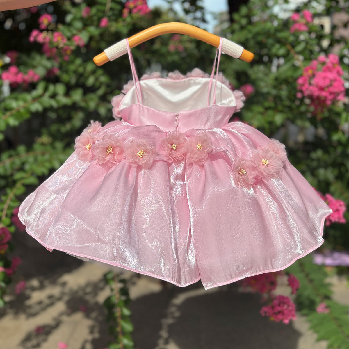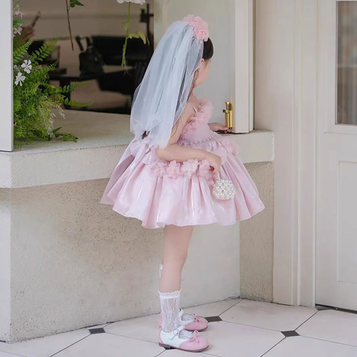 Sling Pearls Satin Pink Flower Girl Dress with Headwear D083