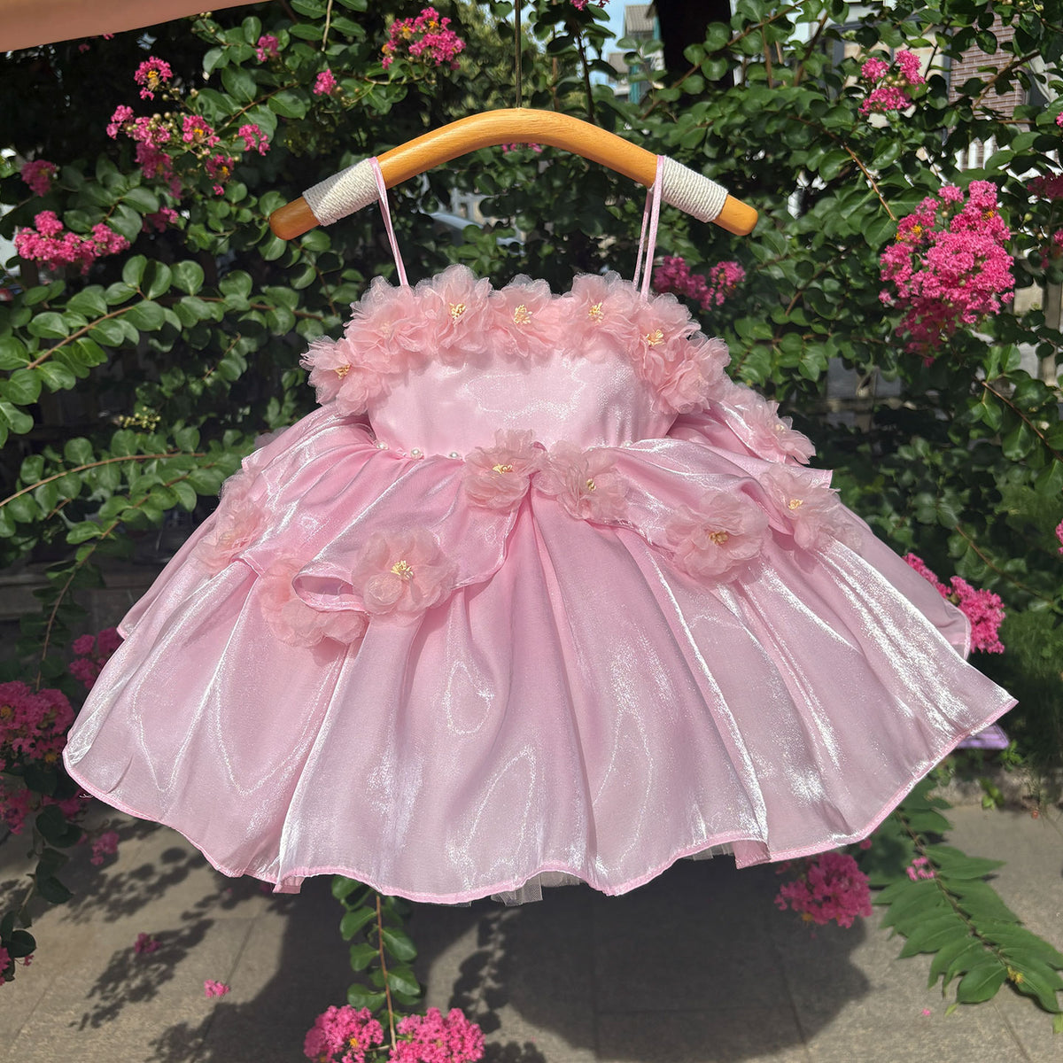 This elegant Jill Sling Dress in satin pink features delicate flower-adorned pearls, creating a refined and charming look for girls. Crafted with attention to detail, its smooth satin fabric ensures comfort while the floral pearl embellishments add a sophisticated touch, perfect for special occasions or formal events.