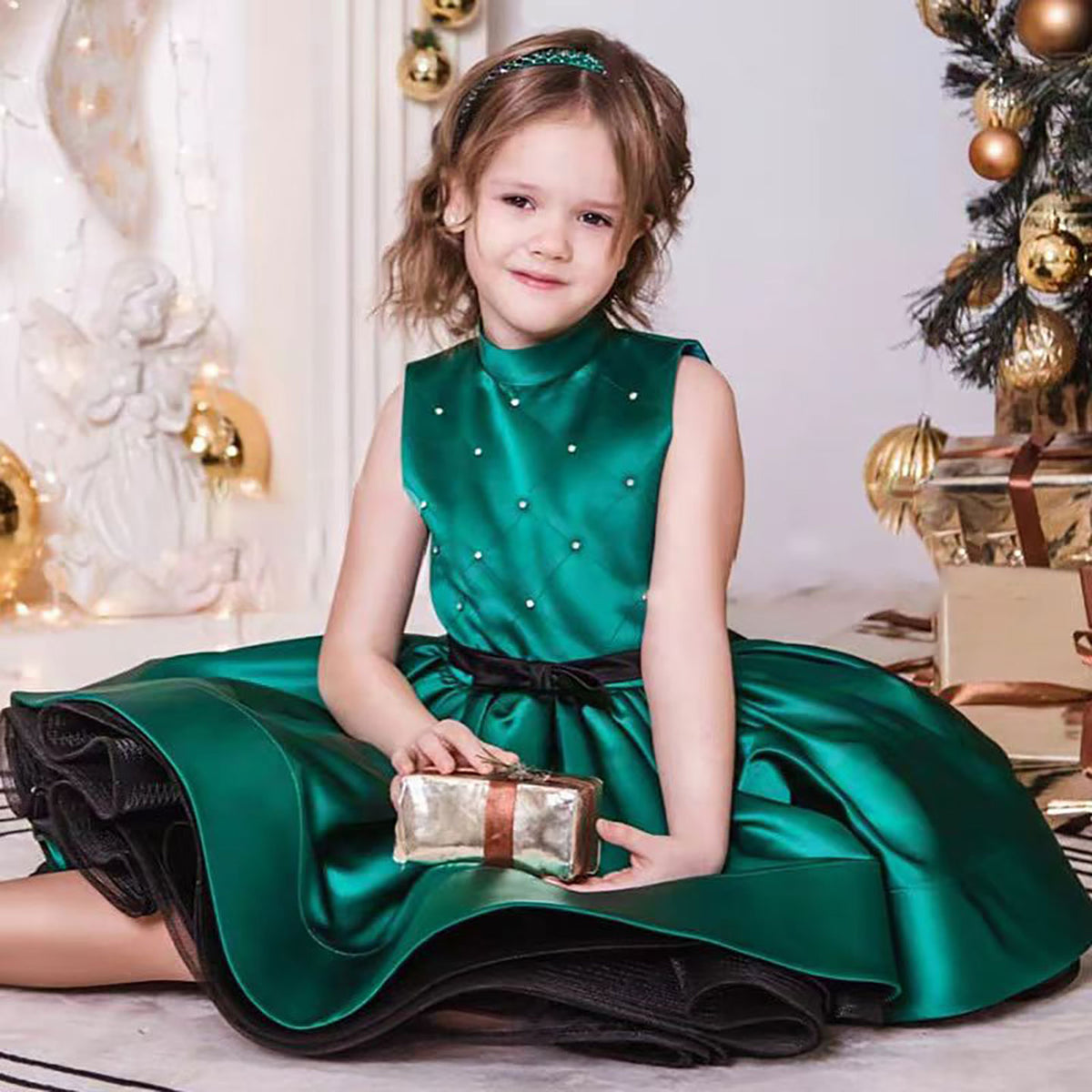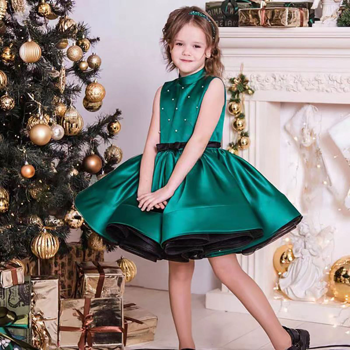 Halter Collar Sleeveless Satin Flower Girl Dress Green D057
