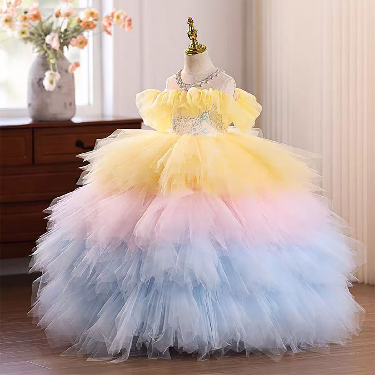 Rainbow Off-Shoulder Ruffled Tiered Tulle Flower Girl Dress D037