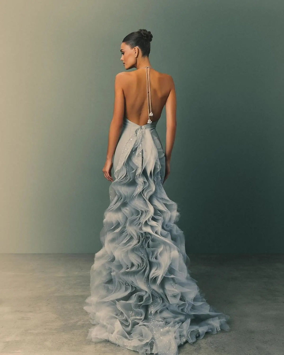Blue Halter Mermaid Evening Dress with Ruffles SS524