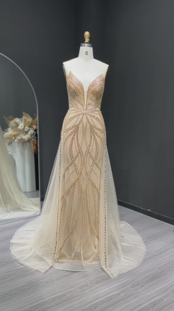 Elegant Champagne Beaded Evening Dress with Flowing Overskirt SS068