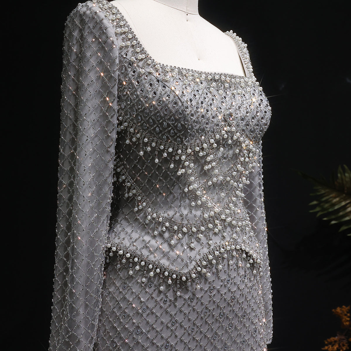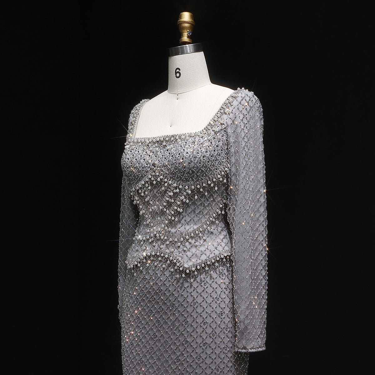 Elegant Gray Square Neck Crystal Evening Dress with Long Sleeves SS633