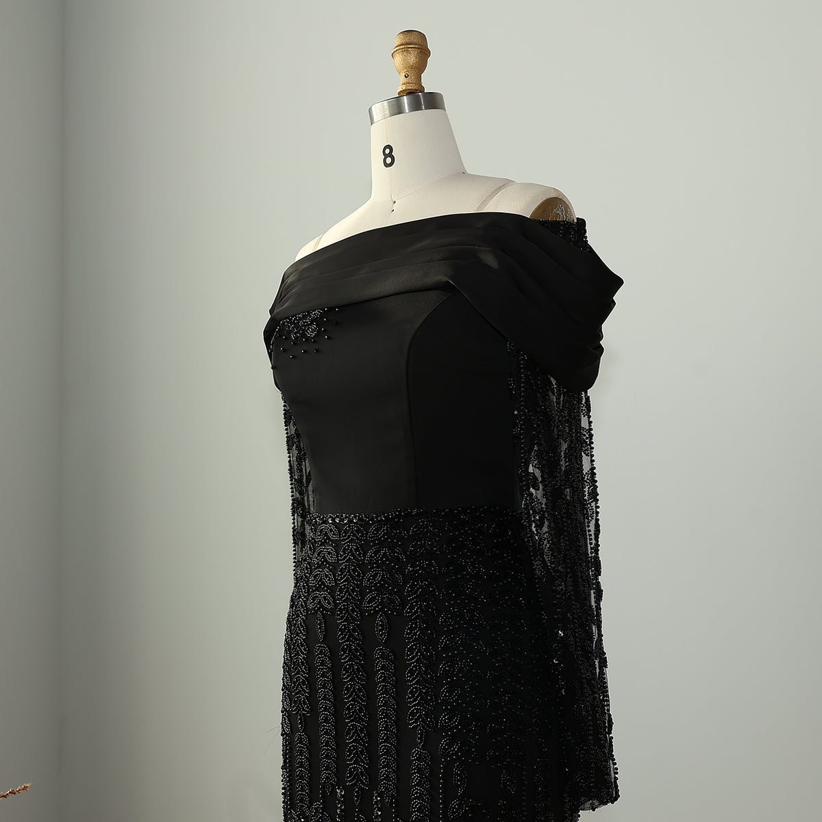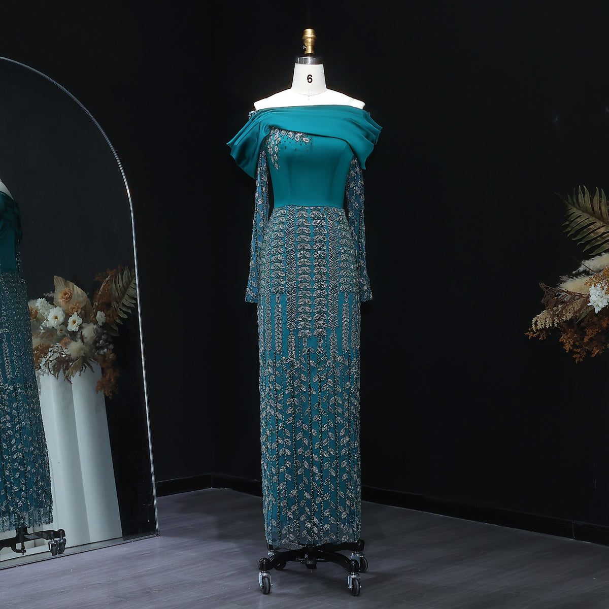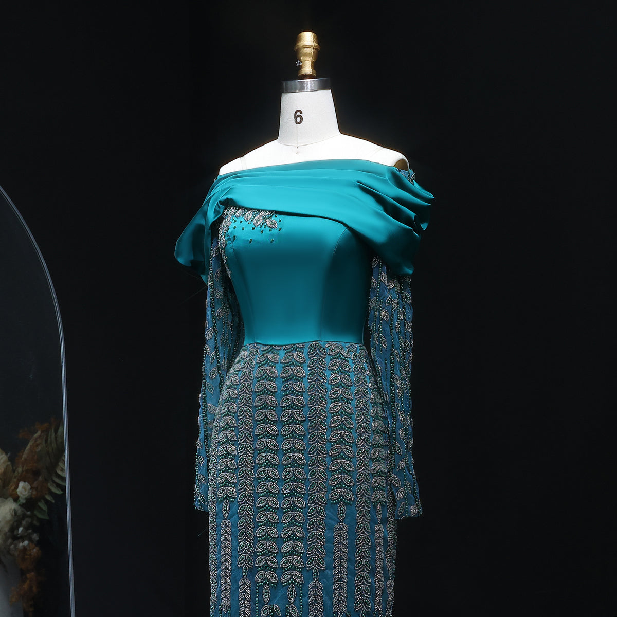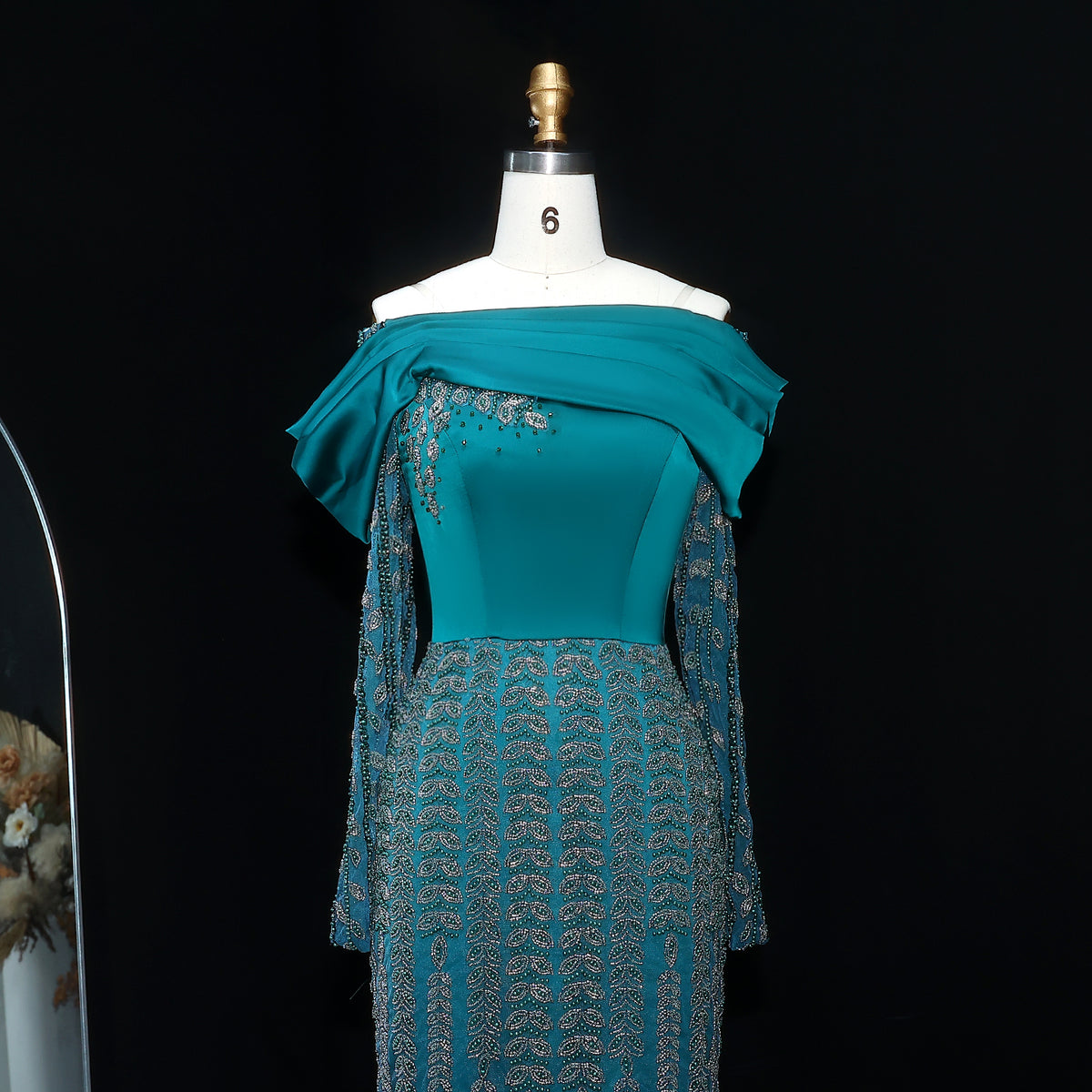 This elegant evening dress features an off-shoulder design and long sleeves, exuding sophistication and class. The perfect choice for formal events and special occasions, this dress will make you stand out with its timeless style. With its flattering fit and comfortable fabric, you'll feel confident and stylish all night long.
