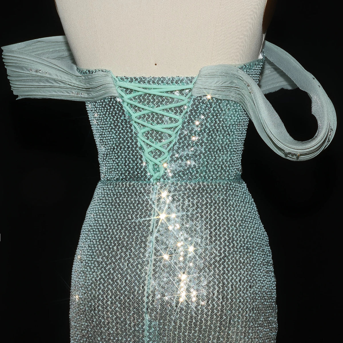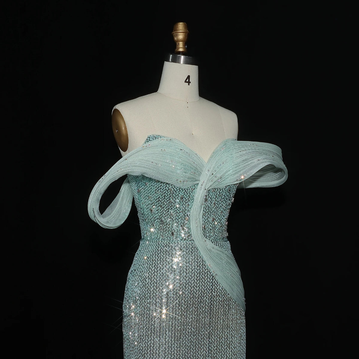 Enhance your elegance with our Elegant Off Shoulder Mint Green Midi Gown, perfect for weddings, parties, and proms. The striking mint green color and midi length create a sophisticated look, while the off shoulder design adds a touch of modern charm. Stand out in style with our SS523 gown.